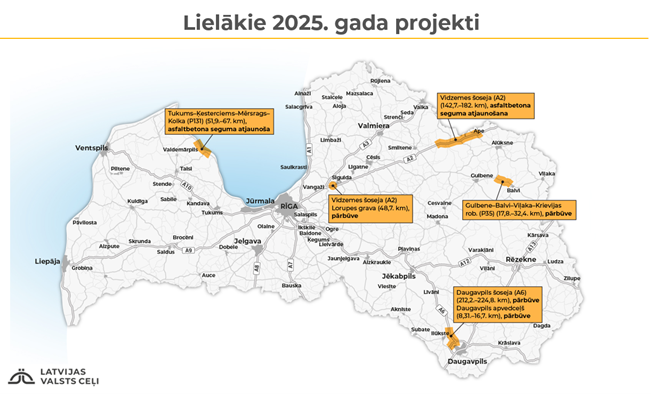 Plašākie būvdarbi, kas šogad tiks sākti, būs Daugavpils šosejas (A6) pārbūve no Līksnas pagasta Gančauskiem līdz Daugavpils apvedceļam (A14) un Daugavpils apvedceļa pārbūve no krustojuma ar Daugavpils šoseju līdz Sventei, reģionālā autoceļa Gulbene-Balvi-Viļaka-Krievijas robeža (P35) pārbūve no Litenes līdz Balviem, Lorupes gravas viadukta pirms Siguldas pārbūve (A2) un vēsturiskās Lorupes caurtekas atjaunošana (V96).