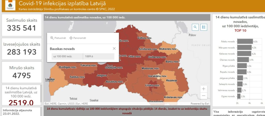Divu nedēļu kumulatīvā saslimstība Latvijā ir pieaugusi līdz 2519 gadījumiem uz 100 000 iedzīvotāju. Savukārt zemākā saslimstība pašlaik ir Varakļānu, Rēzeknes, Dienvidkurzemes, Krāslavas un Alūksnes novados.