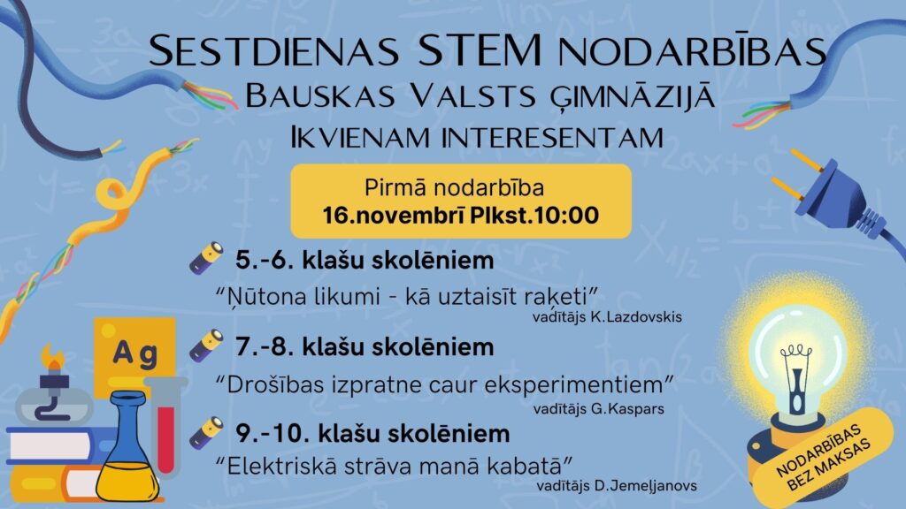 Nodarbības notiks sestdien, 16. novembrī, no plkst. 10 līdz 12 Bauskas Valsts ģimnāzijas telpās. Katrai klašu grupai sagatavota īpaša programma. Piekto un sesto klašu skolēni varēs piedalīties nodarbībā “Ņūtona likumi – kā uztaisīt raķeti?”, kuru vadīs BVĢ pedagogs Kārlis Lazdovskis. 7.-8. klašu skolēniem būs iespēja iedziļināties drošības jautājumos caur dažādiem eksperimentiem nodarbībā ar BVĢ ķīmijas skolotāju Gintu Kasparu, savukārt 9.-10. klašu skolēniem BVĢ pedagogs Dmitrijs Jemeļjanovs vadīs praktisku nodarbību “Elektriskā strāva manā kabatā”. Nodarbības ir bez maksas.