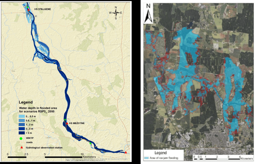 Ledus plūdu kartes Lielupes upei (pa kreisi) atbilstoši RCP 8.5 un Lėvuo upei (pa labi) atbilstoši SSP2-4.5 laika periodam no 2021.-2050. g. Foto: LVĢMC