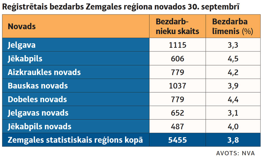 Reģistrēto bezdarbnieku skaits Bauskas novadā uz šī gada septembri bija 1037, bet Zemgales reģionā kopumā – 5455.