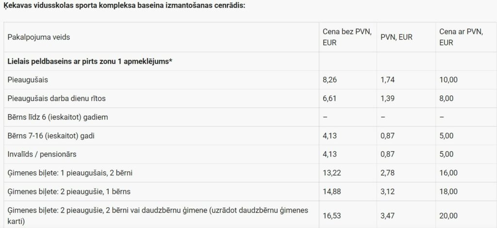 Maksa par Ķekavas baseina izmantošanu *1 apmeklējums – peldēšanas ilgums 50 minūtes: