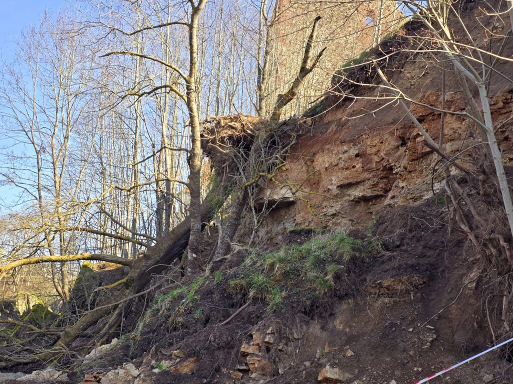 Tāpat, tiklīdz iespējams, jānovērš nogruvuma sekas un jāaizvāc sakritušie koki. Prioritāri veicamajos soļos ietilpst arī darbs pie šīs pilskalna nogāzes stiprināšanas projekta izstrādes. Vispirms jāveic tehniskā izpēte, jāsagatavo topogrāfiskais materiāls un arheologa uzraudzībā jāveic ģeoloģiskie urbumi zemes pamatnes izpētei, norāda pašvaldības Attīstības un būvniecības departamenta vadītājs Mārtiņš Veinbergs.