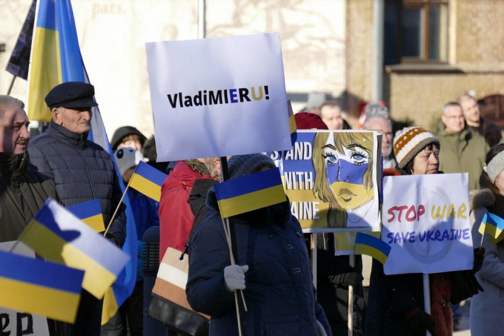 Solidarizējoties ar Ukrainu un tās tautu, atbalstot Ukrainas valsts suverenitāti un teritorijas nedalāmību, svētdien, 27. februārī, Valmieras Rātslaukumā norisinājās mītiņš. Foto: valmierasiznas.lv