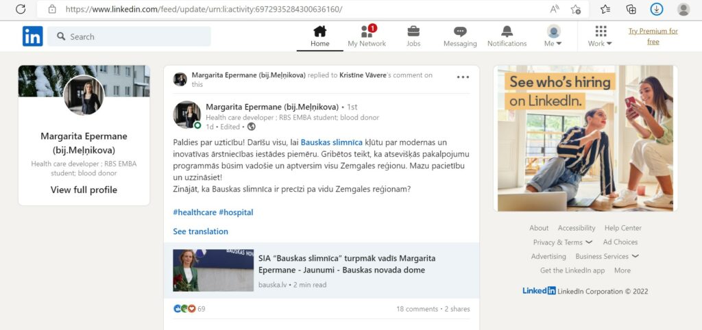 Savā sociālā tīkla «LinkedIn» kontā viņa norādījusi: «Darīšu visu, lai Bauskas slimnīca kļūtu par modernas un inovatīvas ārstniecības iestādes piemēru. Gribētos teikt, ka atsevišķās pakalpojumu programmās būsim vadošie un aptversim visu Zemgales reģionu. Mazu pacietību, un uzzināsit!»