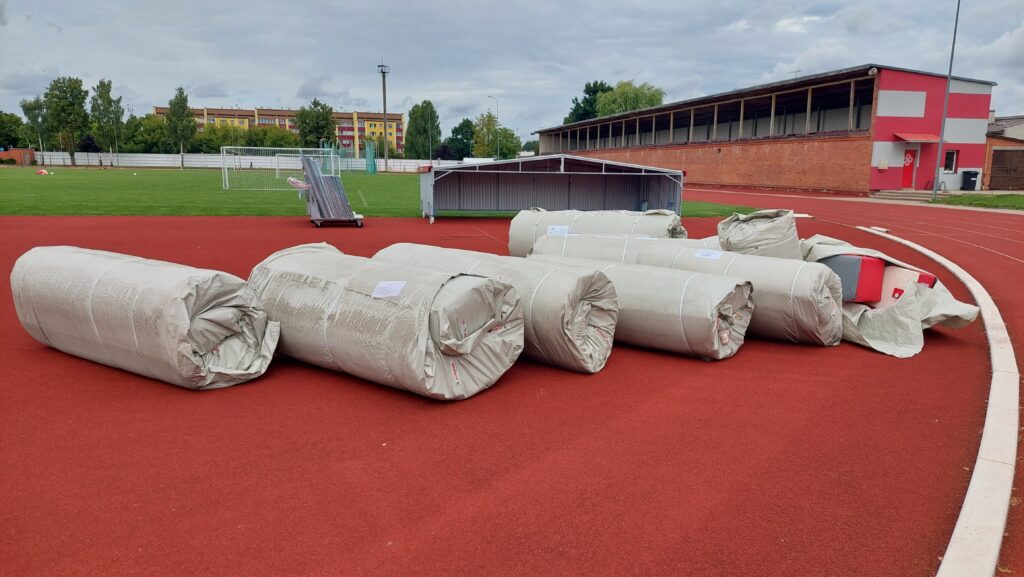 Attēlā – Bauskas pilsētas stadionā ceturtdien sāka uzstādīt kārtslēkšanas paklāju.