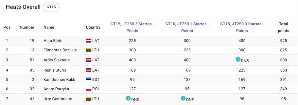 Savukārt GT15 laivu klasē abus pirmos braucienus pārliecinoši uzvarēja Ardis Slakteris. Tomēr tehniska neveiksme neļāva piedalīties pēdējā braucienā, un kopvērtējumā uzvarēja latviete Hēra Žaklīna Biete. Ceturtais kopvērtējumā – Reinis Stūris.