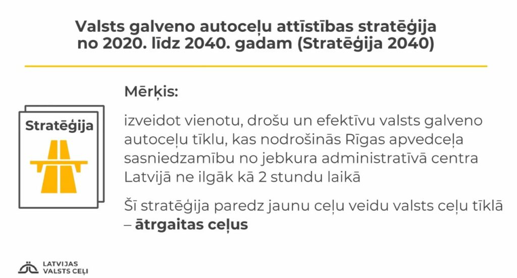 Viņš atgādināja, ka 2021. gadā tika pieņemta Valsts autoceļu attīstības stratēģija līdz 2040. gadam.  Šīs stratēģijas mērķis ir – attīstīt valsts galveno autoceļu tīklu tādu, lai no katra administratīvā centra līdz  Rīgas apvedceļam varētu nonākt divās stundās.