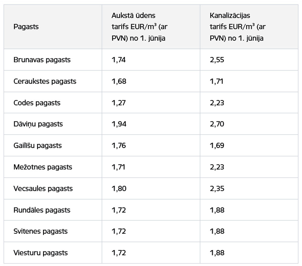 Bauskas novada domes sēdē deputāti 25. maijā apstiprināja izmaiņas (samazinājumu) aukstā ūdens un kanalizācijas tarifos Brunavas, Ceraukstes, Codes, Dāviņu, Gailīšu, Mežotnes, Vecsaules, Rundāles, Svitenes un Viesturu pagastā.