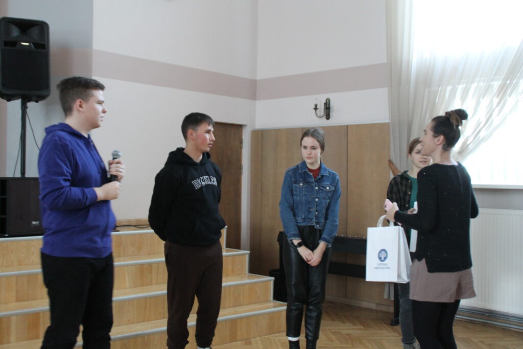 Prezentāciju noslēdza interaktīvā «Kahoot» spēle ar uzdevumiem un jautājumiem par saklausīto, uzzināto un redzēto, un pirmo trīs vietu ieguvējiem tika balviņas no Latvijas Universitātes.