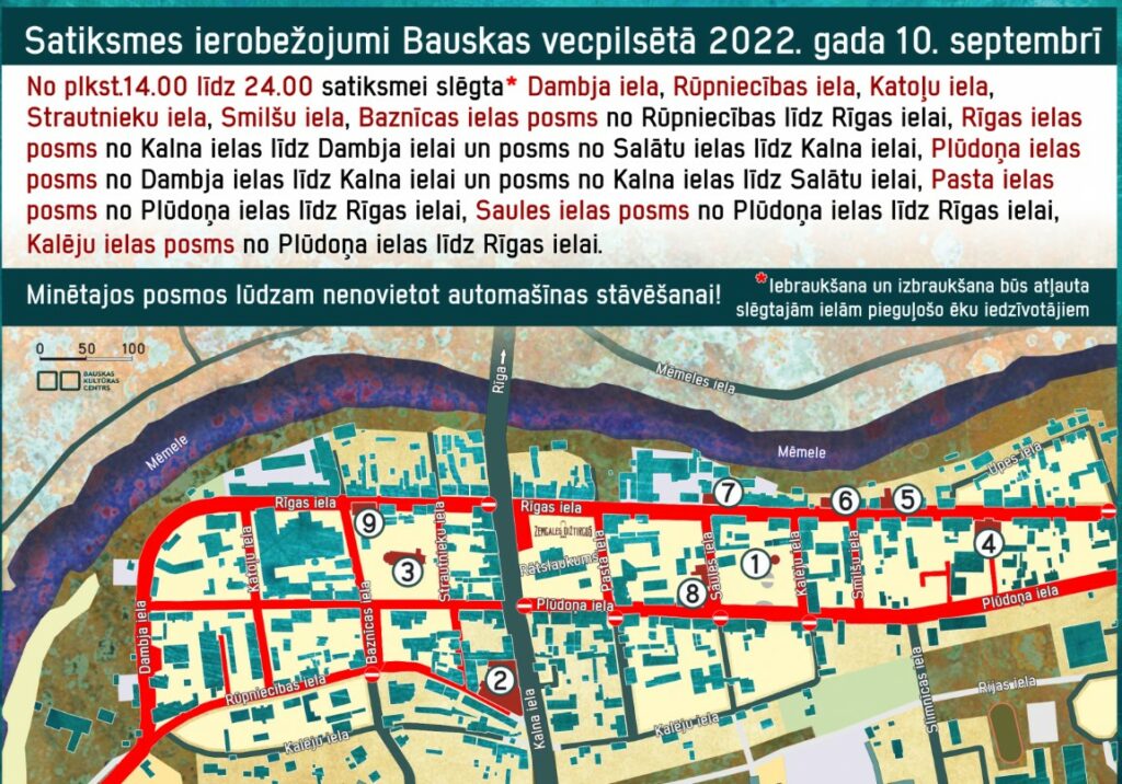 Iebraukšana un izbraukšana būs atļauta slēgtajām ielām pieguļošo ēku iedzīvotājiem. Minētajos posmos Bauskas kultūras centrs lūdz nenovietot automašīnas stāvēšanai uz ielām. Pilsētas iedzīvotājus uz pasākumu aicinām doties ar kājām.