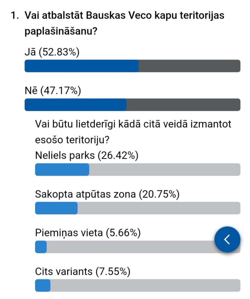 Līdz 24. aprīļa agram rītam Bauskas novada pašvaldības mobilajā lietotnē aptaujā bija piedalījušies 53 respondenti. Atbildot uz jautājumu, vai atbalstāt Veco kapu teritorijas paplašināšanu, 52,83 % aptaujas dalībnieku norādīja, ka atbalsta šo ieceri, savukārt 47,17 % bija pret.