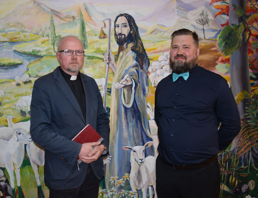Iecavas ev. lut. draudzes mācītājs Rolands Radziņš un draudzes priekšnieks Kaspars Svirskis pie sienas gleznojuma «Ticība, cerība, mīlestība». Foto: Māris Krūmiņš.
