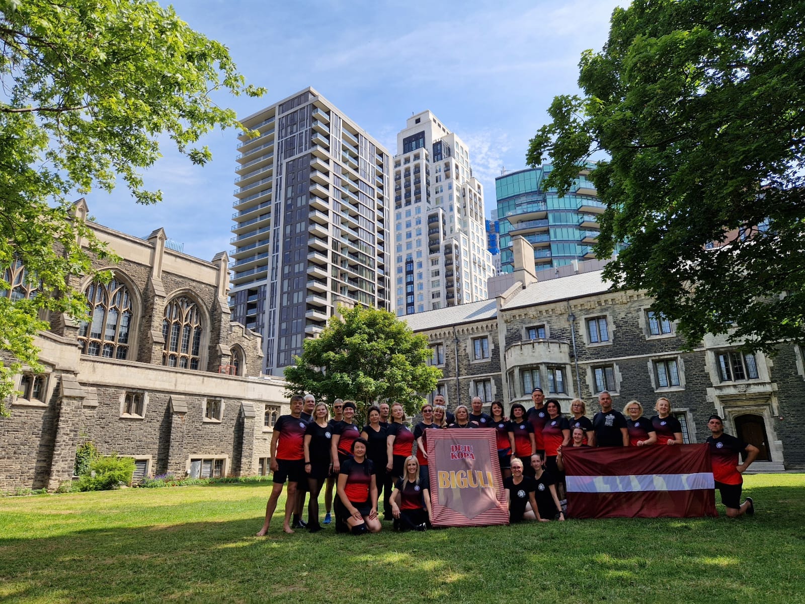 “Dzīvojam fantastiskā studentu viesnīcā, gandrīz pašā Toronto centrā, kur jaunās arhitektūras debesskrāpji kontrastē ar senajām studentu pilsētiņas ēkām. Šeit ir sajūta, ka esam nokļuvuši Harija Potera filmēšanas laukumā. Neskatoties uz septiņu stundu laika starpību, kam pirmajās dienās grūti pierast, jau aktīvi piedalāmies mēģinājumos un izbaudām Toronto viesmīlību, piemēram, ceturtdien devāmies izbraucienā ar kuģīti pa Ontārio ezeru,” iespaidos dalās “Biguļu” vadītāja Santa Zemīte.