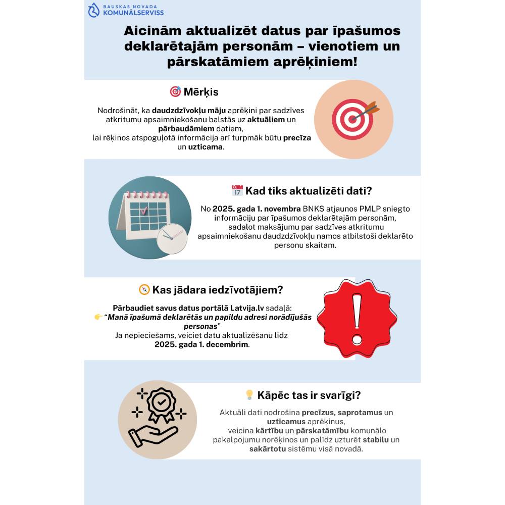 Iedzīvotāji aicināti līdz šī gada 1. decembrim pārbaudīt un, ja nepieciešams, aktualizēt informāciju portāla Latvija.lv sadaļā “Manā īpašumā deklarētās un papildu adresi norādījušās personas”, lai nodrošinātu, ka turpmāk atkritumu apsaimniekošanas maksas aprēķini būs balstīti uz aktuāliem un pārbaudāmiem datiem.