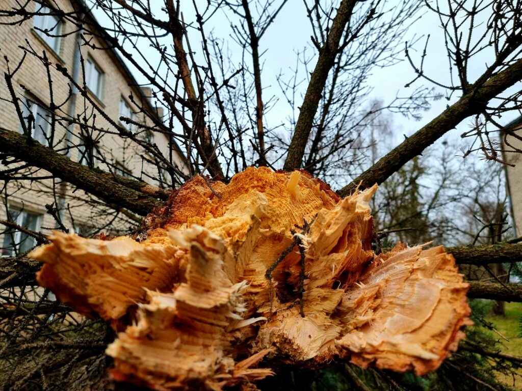 Starp Dārza ielas daudzdzīvokļu namiem augošās egles stumbrs neizturēja stiprās vēja brāzmas, kas šajā naktī traucās pāri pilsētai. Koks nolūza un laimīgā kārtā nogāzās zālienā, saraujot vien televīzijas gaisa kabeļu līnijas. Tā kā bija naktsmiera periods, egles tuvumā neviena cilvēka nebija.