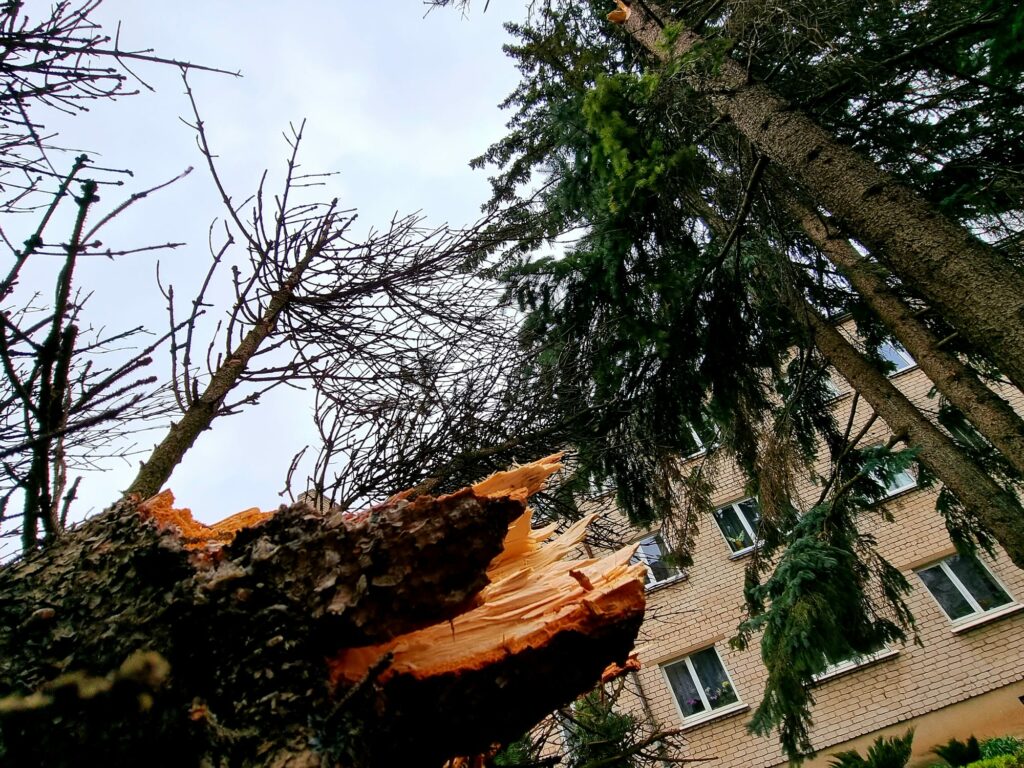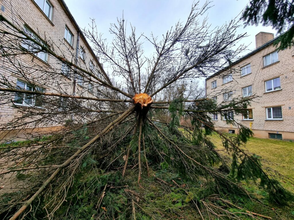 Vēja postījumus agrā rīta stundā bija fiksējusi sētniece Mirdza Biguze. «Pulksten sešos no rīta tā jau gulēja gar zemi. Te brauca apzāģēt vecos kokus, bet vēl ir pulka neapzāģētu. Nedaudz tālāk ir koks, kas nedaudz ieplīsis, tur stāv liepa, kas nokaltusi, un esmu teikusi, bet neviens neko nedara. Būtībā pie vainas arī ir cilvēki, jo, kā sāk darbināt zāģus, tā ir lamāšanās un liela neapmierinātība un neļauj nozāģēt ne zariņa. Taču koki ir jākopj!» pārliecināta ir sētniece. Viņa šeit savus pienākumus veic jau 11 gadu un zina stāstīt, ka mājas celtas sešdesmitajos gados. Visticamāk, tad arī iestādītas egles, kas sākotnēji bija mazas un apdraudējumu neradīja.