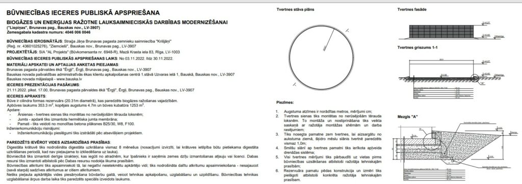 Pamatojoties uz to, ka biogāzes un enerģijas ražotnes izveide lauksaimnieciskās darbības