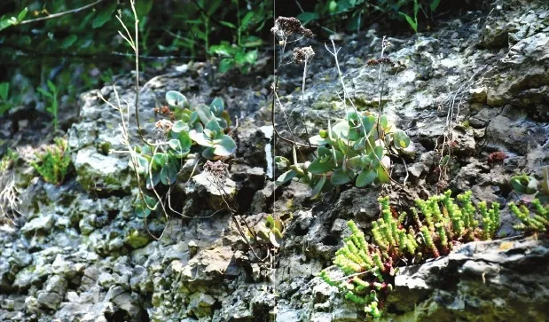 Vēl manām sausseržus, kas ļoti labi jūtas lielo koku pavēnī, upju meža indikatoru apiņus, krasta veronikas, kuras tūliņ raisīs zilās ziedu vārpas, akmeņos augošu nokareno plaukšķeni, stīgojošu meža dedestiņu. Tās gan nav retas sugas, taču apbrīnojami labi pielāgojušās skarbajiem augšanas apstākļiem.