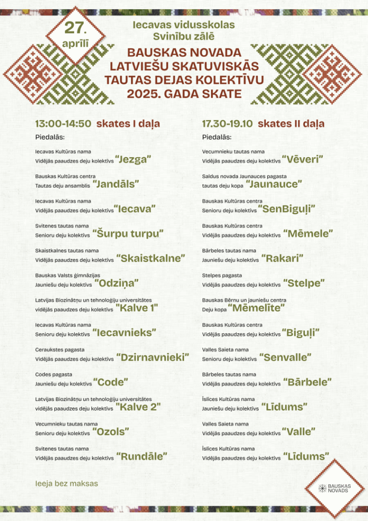 Svētdien, 27. aprīlī, Iecavas vidusskolā Bauskas novada tautas deju kolektīvi tiksies IX Vidējās paaudzes dejotāju svētku koprepertuāra un Bauskas novada jauniešu, senioru deju kolektīvu repertuāra pārbaudes skatē, “Bauskas Dzīve” uzzināja pašvaldībā. Interesenti aicināti vērot skati un atbalstīt dejotājus. Ieeja pasākumā ir bez maksas.