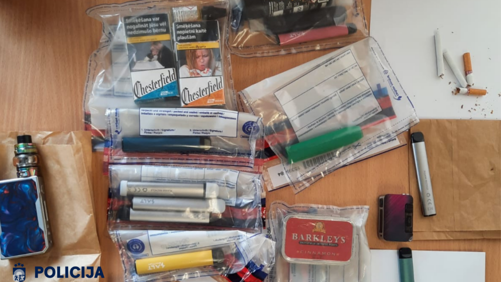 Tāpat pārbaudes laikā policisti konstatēja, ka četri jaunieši pie sevis glabā cigaretes un tabakas izstrādājumus, savukārt deviņi jaunieši – elektroniskās smēķēšanas ierīces, tādējādi pārkāpjot Bērnu tiesību aizsardzības likuma 48. panta pirmo daļu, kas nosaka, ka bērns nedrīkst smēķēt, lietot bezdūmu tabakas izstrādājumus, glabāt tabakas izstrādājumus, augu smēķēšanas produktus, elektroniskās smēķēšanas ierīces un to uzpildes tvertnes. Visos 13 gadījumos arī tika uzsākti administratīvo pārkāpumu procesi.  Kopumā dienesta suns pie jauniešiem atrada 31 cigareti, tabakas izstrādājumus, divas elektroniskās smēķēšanas ierīces uzpildes šķidruma tvertnes un 12 elektroniskās smēķēšanas ierīces.