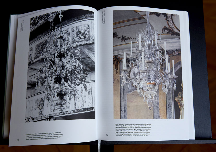 Grāmatā lustras redzamas kopskatā no attāluma un pēc tam attēls uz melna fona, kas lieliski atklāj lustras siluetu. Tad atgriežamies pie idealizētas formas – ideālas gaismas apstākļos. Šādā veidā strādājām ar visām 12 lustrām. Nianses mikrolīmenī labi atklājas Rožu istabas lustrā; attēlā redzams, ka tās augša pie pamatnes ir neitrāla, bet apakšējā daļa ir violetāka. Ar neapbruņotu aci to nevar pamanīt, taču fotokamera to dara lieliski… Stikla lustru ir ļoti grūti fotografēt, pacietīgi jāmeklē un jāatrod fotogēniskākais rakurss. Ceru, ka tas ir izdevies un lasītājiem būs interesanti aplūkot šo vērtīgo zinātnisko izdevumu.»