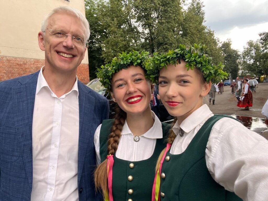 Dziesmu un deju svētkos, pēc pirmā deju lieluzveduma «Mūžīgais dzinējs» koncerta, Bauskas novada Īslīces pagasta jauniešu deju kolektīva «Līdums» dalībnieces Alise Kalderauska un Kerija Stefānija Strupiša nobildējās kopā ar ministru prezidentu Krišjāni Kariņu. Arī šis brīdis raisījis prieku. Foto no personiskā albuma.