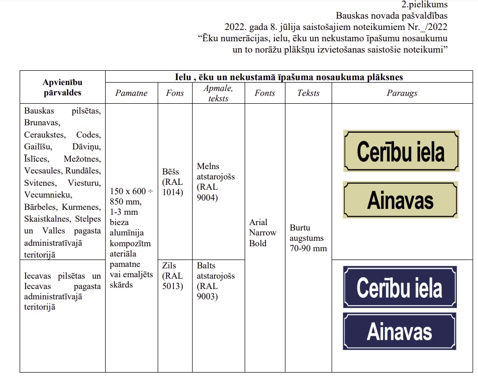 Ēku un ielu apzīmējumu plāksnēm noteikumos paredzēts vienāds izskats Bauskas pilsētas, Brunavas, Ceraukstes, Codes, Gailīšu, Dāviņu, Īslīces, Mežotnes, Vecsaules, Rundāles, Svitenes, Viesturu, Vecumnieku, Bārbeles, Kurmenes, Skaistkalnes, Stelpes un Valles pagasta administratīvajā teritorijā – ar melnu apmali un tekstu uz smilšu krāsas fona.