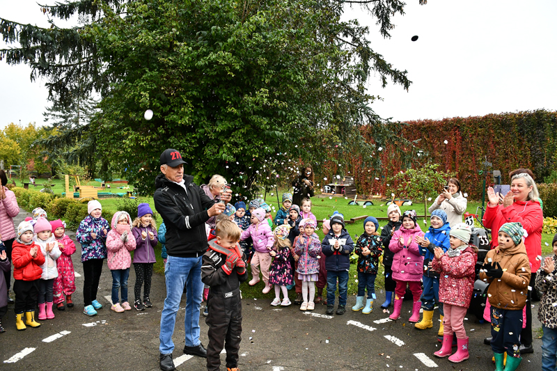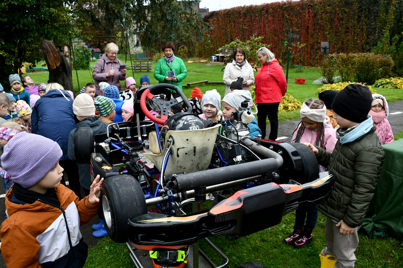 Bērnudārza pagalmā sapulcējās piecu pirmsskolas izglītību grupiņu – «Dzirnaviņu», «Dzīpariņu», «Podziņu», «Kamenīšu» un «Zvaniņu» – audzēkņi, turpat tika izvietots arī Olivera Vilhelma sacensību bagijs un kartinga auto.