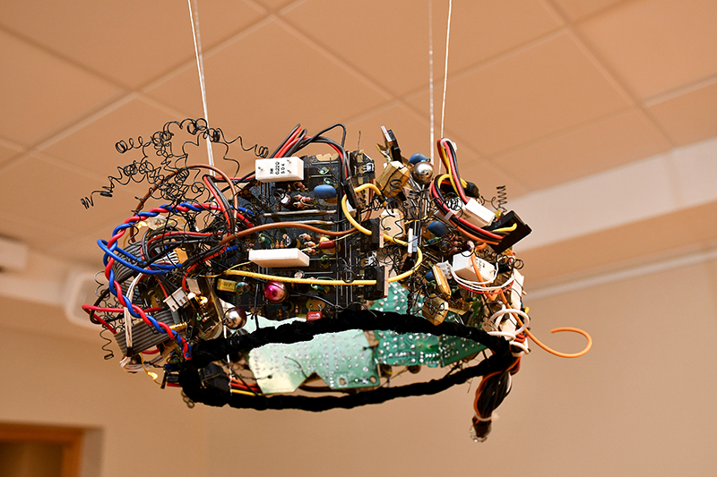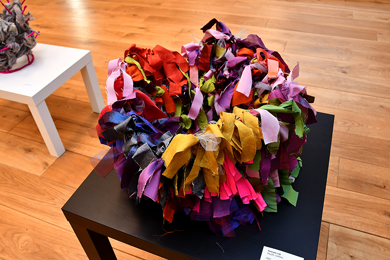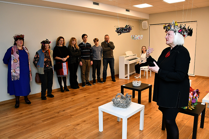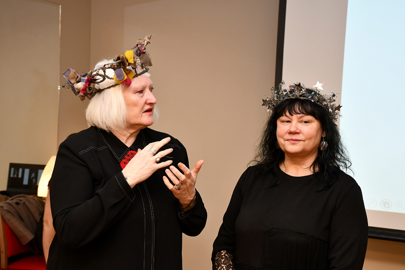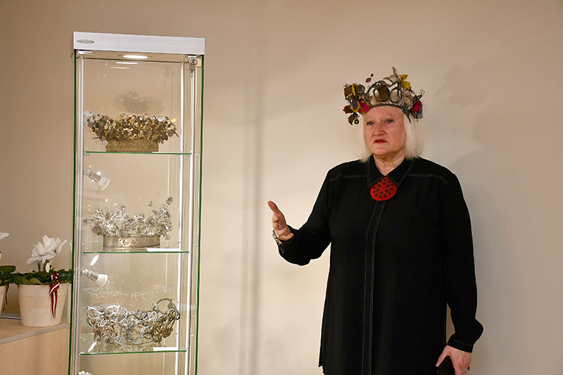 Izstādes atklāšanā B. Stroda ilustrēja kroņu tapšanu. Viņa pastāstīja, ka ar mākslinieci Ilzi Tiguli meklējusi materiālus krāsaino metālu “točkās”. Atradušas veselu baļļu ar metāla skaidiņām ,kuras ar lielu prieku savāca un gatavojās ķertie pie kroņa veidošanas. Mājās sapratušas, ka kroni nevar darināt, jo detaļas ir asas kā žilete un var savainot kroņa nēsātāju. Lai no kroņa nav jāatsakās, tas apņemts ar ļoti trauslu zīda organzu, kura savāc šo bīstamo metālu. Foto: Ivars Bogdanovs