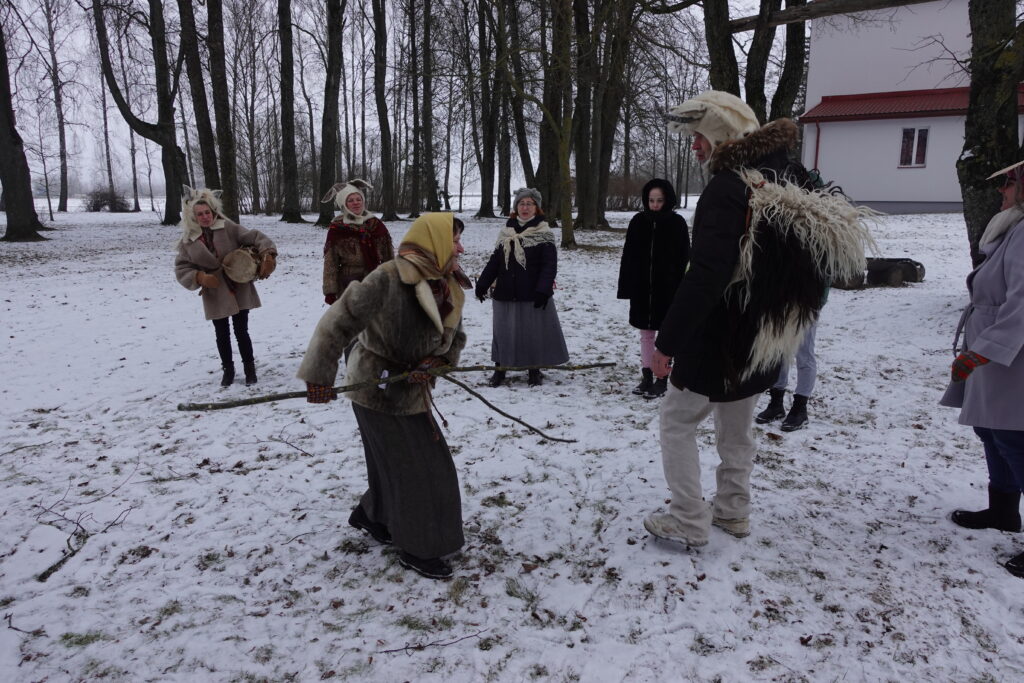 Folkloras kopas dalībnieki stāsta, ka Meteņa dienā jālaižas ar ragavām, tāpēc norisinājās aktivitāte, kuras laikā divām komandām bija jāizvizina komandas biedri ragavās pa noteiktu trasi pēc iespējas ātrāk. Veiklību nācās pierādīt arī ar kartupeļa nešanu koka karotē, skrienot ap koku, kā arī virves vilkšanā.