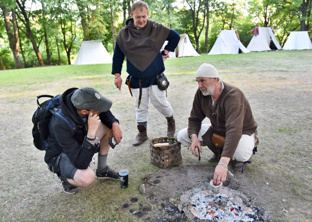 Daļu no rotām pēc lekcijas varēja iegādāties pie meistariem senajā pilsētiņā, viņu vidū bija arī Bauskas novada Ceraukstes pagasta meistari Māris Braže un Elīna Kūla-Braže. M. Braže iedarbināja savu minicepli, kuru veidoja ar māla palīdzību bedrē zemē un nokarsēja ar plēšām.