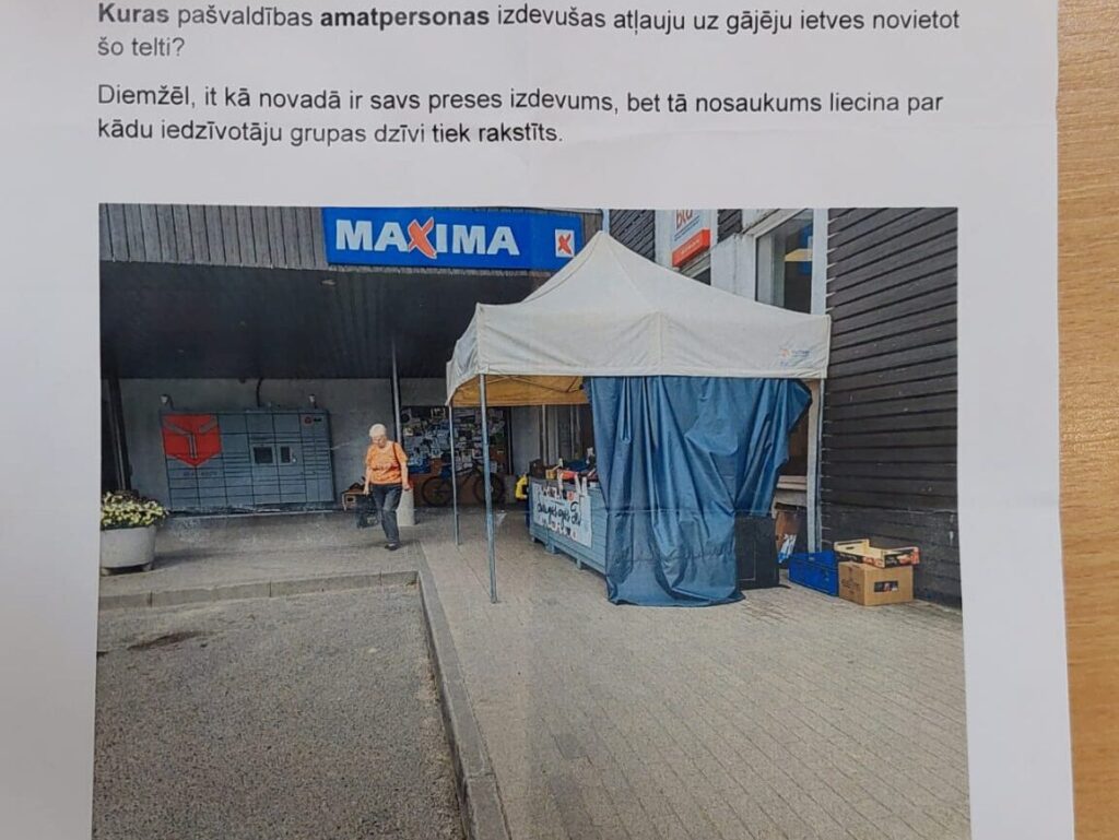 Kuras pašvaldības amatpersonas izdevušas atļauju uz gājēju ietves novietot šo telti?