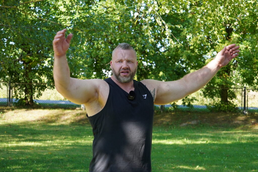 Pēc aktīvajiem uzdevumiem bērni sapulcējās ēnā zem koka, lai skatītos spēkavīra Didža Zariņa sagatavotos spēka demonstrējumus, kuros iesaistīti tika arī paši ciemata iedzīvotāji. Bērni pārsteigti vēroja, kā spēkavīrs bez pārāk lielas piepūles saloka dažāda biezuma metāla stieņus, kā arī pannu, kura tika atstāta ciematā kā suvenīrs.