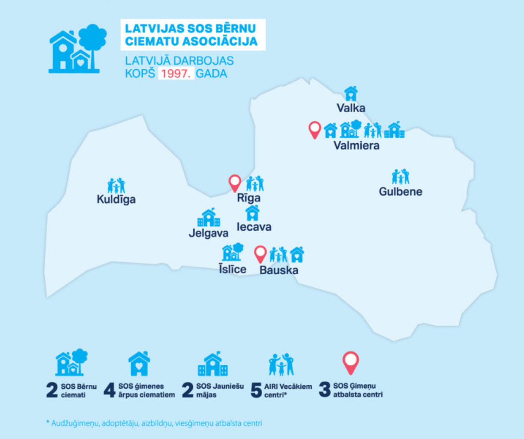 SOS bērnu ciemati Latvijā izveidoti un darbojas Īslīcē un Valmierā.