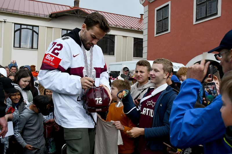 Pazīstamo sportistu sveica Bauskas novada domes priekšsēdētājs Aivars Okmanis, kurš pirmais saņēma autogrāfu un dāvināja hokejistam Bauskas novada uzņēmēju sarūpētu gardumu grozu.