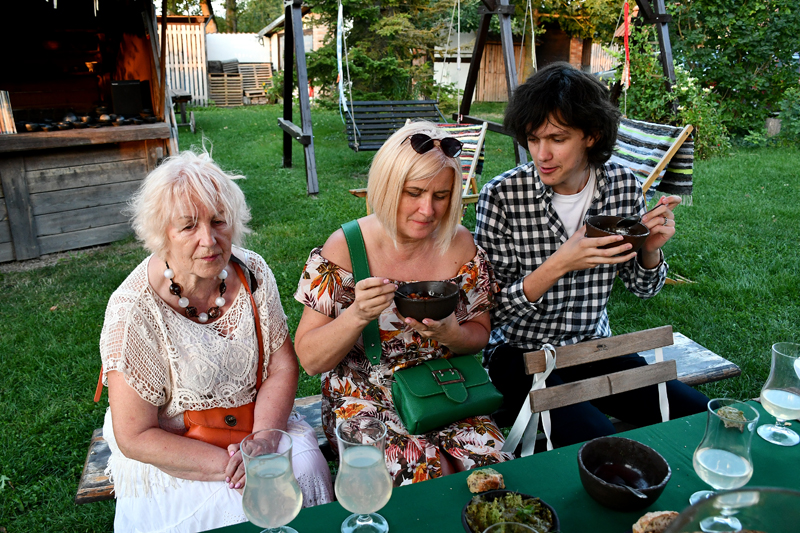 Bet vispirms viesi tika cienāti ar S. Ikertes pēc Kaucmindes saimnieču receptes vārītu vistas gaļas zupiņu ar dārzeņiem, tostarp nepelnīti aizmirstiem kāļiem, un mīklas klimpiņām. Un tad bija siera kūciņas, pašiem apmeklētājiem ar gaļas mašīnu maļamie cepumiņi kā omīšu laikos… Viss nav aprakstāms. Un noslēgumā someljē – smalki no franču valodas, bet latviski – vīnzines stāsti un ieteikumi par vīniem, to darīšanu un malkošanu.