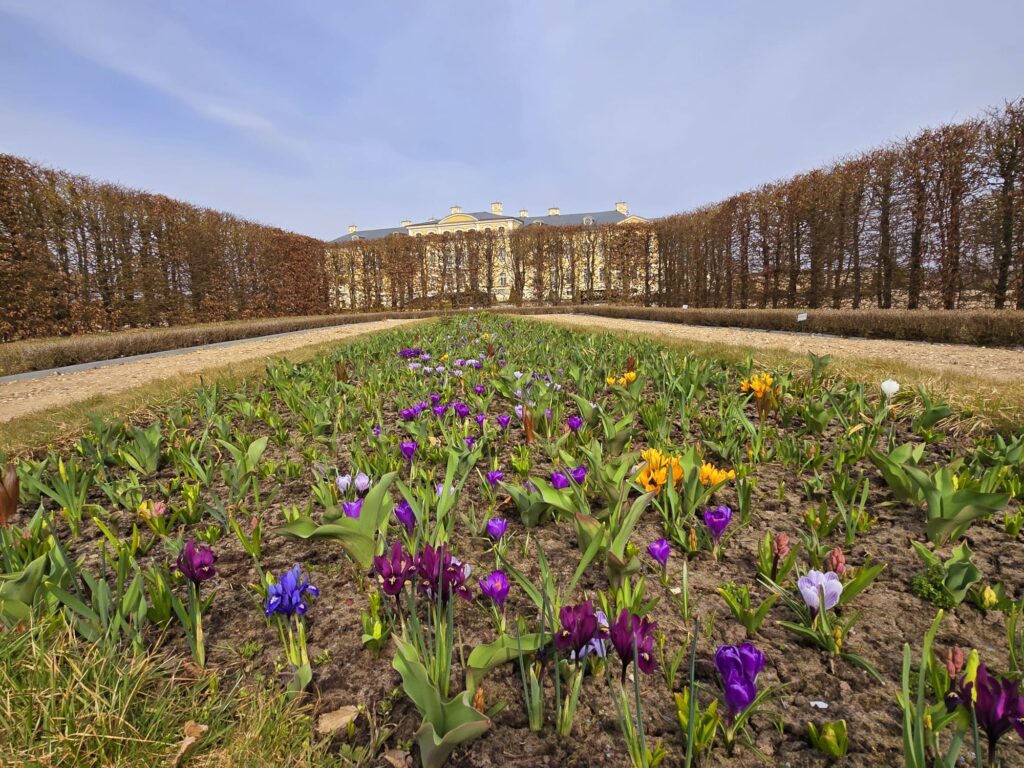 Pavasaris ir klāt, un pamazām mostas arī Rundāles pils franču dārzs. No ziemas miega te cēlusies strūklaka, kas ienes dzīvīguma šalti apkārtnē. Dažādu krāsu krokusi sparīgi slej galvas saules virzienā, dārza apmeklētājus sveicina arī baltās sniegpulkstenītes.