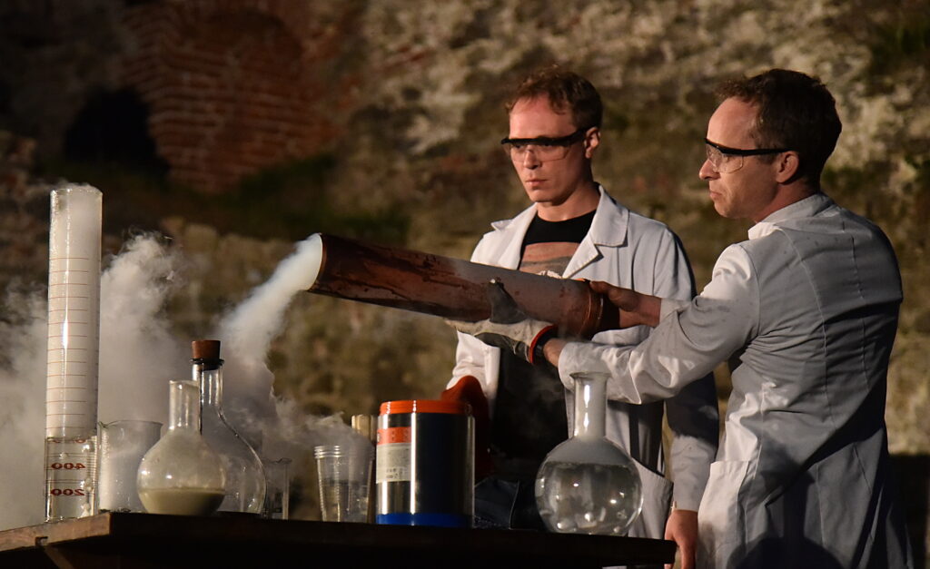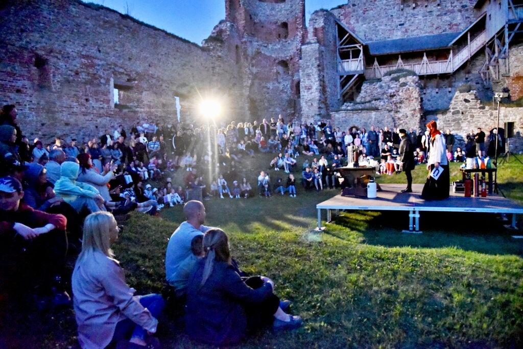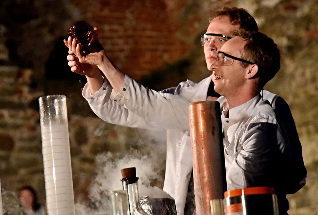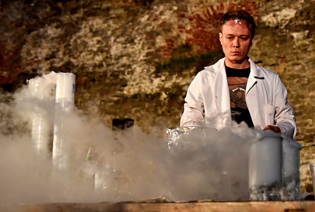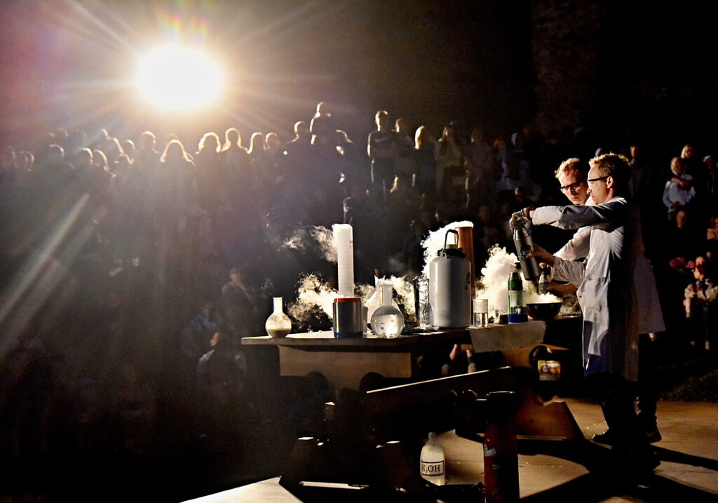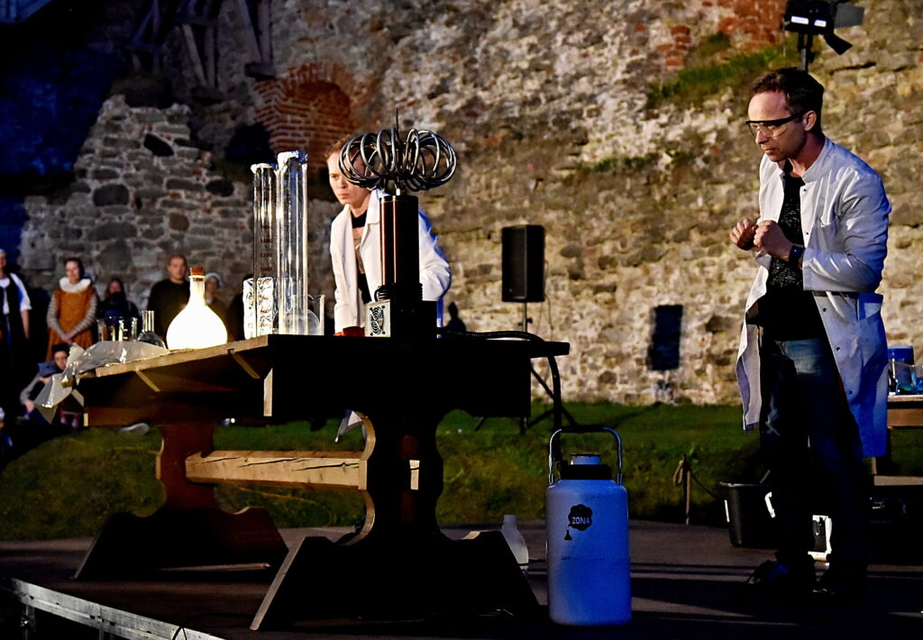 Jau gandrīz nakts tumsā visi interesenti pulcējās Livonijas ordeņpils pagalmā, kur ķīmiķi no «Laboratorium.lv» bija piekrituši hercoga izaicinājumam un centās radīt filozofu akmeni – vielu, kas parastos metālus pārvērš zeltā vai sudrabā un spēj dot cilvēkam nemirstību vai mūžīgo jaunību.