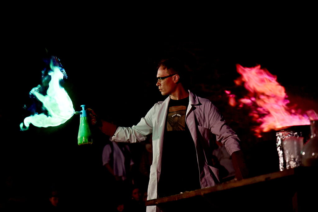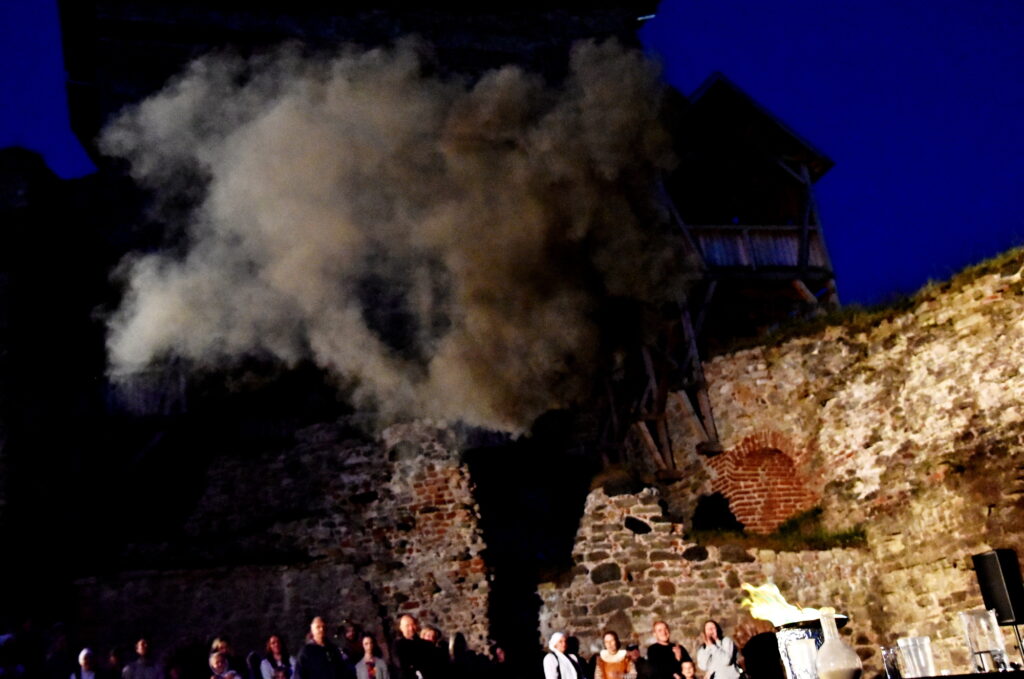 Skatītājus meistari nepievīla – dūmi vijās pa visu pagalmu, dega zaļas un purpura liesmas, uguns mēles rāvās uz debesīm, vīri demonstrēja spējas pārvaldīt zibeni.