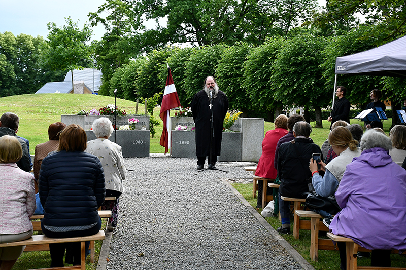 «Vēl kara priekšvakarā Latvijas valdība noslēdza līgumu ar Krieviju par ieroču piegādi… apmaksāja ieročus, kas pavisam drīz tika pavērsti pret pašiem. Cik daudz traģiskas līdzības ar šodienas situāciju – ar visām mangāna kravām un asinsgraudiem! Daudzi arī joprojām uzskata, ka varbūt nevajag kaitināt Putinu, bet vēsture māca ko citu,» sacīja mācītājs. Kā atbildēt netaisnībai? Nevis mēģinot ar to sadzīvot, bet, esot cilvēkam Dieva priekšā. «Kā Vēstulē romiešiem ir sacīts, – neļauj ļaunumam sevi uzvarēt, bet uzvari ļaunu ar labu. Un kā vēl kāds ir sacījis, – ļaunums var uzvarēt tad, ja labie cilvēki neko nedara. Un arī pašlaik pats svarīgākais ir domāt par to, kā varam darīt labu, – saviem tuvākajiem, savai tautai, savai zemei,» sacīja A. Siliņš, aicinot visus vienoties lūgšanā par mūsu tautu un zemi, pieminot izsūtījumā cietušos, arī tos, kas neatgriezās.
