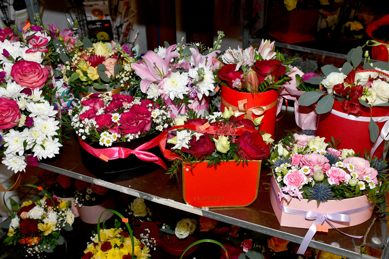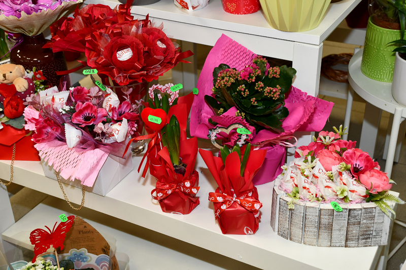 Dārza ielas otrajā pusē – ziedu salonā “Pagrabiņš” čakli darbojas floristes Tatjana Lucenko, Ilva Kokina un Lāsma Ļemeševska. Tirgotavā gādāts par pagarināto darba laiku gan trīspadsmitajā, gan četrpadsmitajā februārī. Te var nopirkt ne tikai grieztos ziedus, bet arī ziedu kompozīcijas un podiņus, šokolādes un apsveikumu kartītes, rotaļlāčus, kā arī sveces. Kad “Bauskas Dzīve” ieradās ziedu salonā, darbinieki gatavojās veikt vairākas ziedu piegādes.