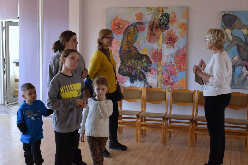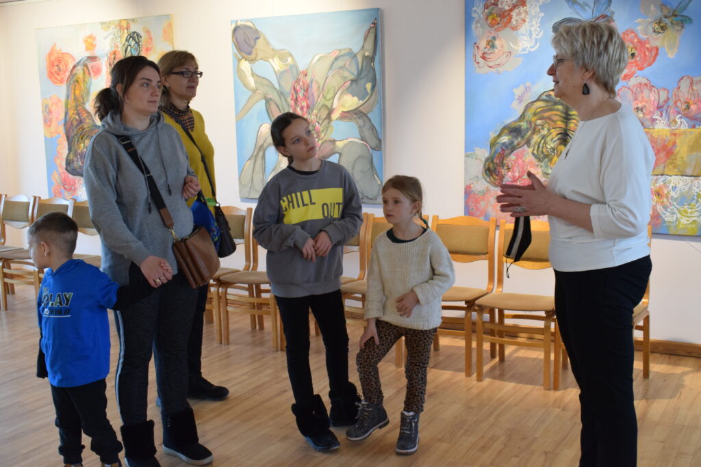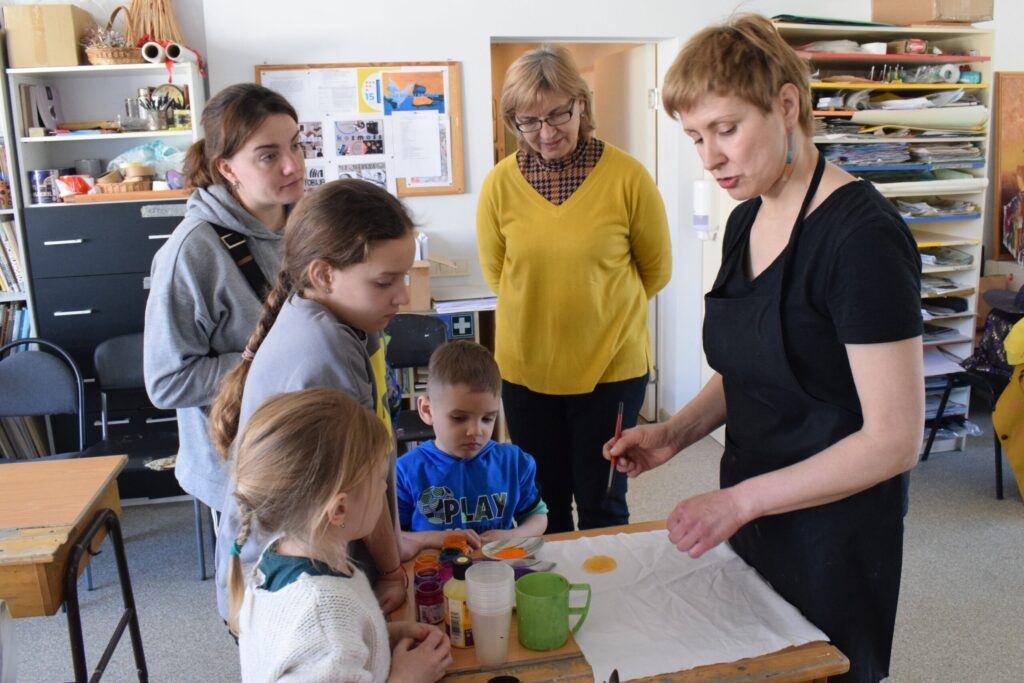 Ukrainas civiliedzīvotājus, kas apmetušies Stelpē, ar Vecumnieku mūzikas un mākslas skolu iepazīstina tās direktore Iveta Lavrinoviča (no labās). Foto – bauskasdzive.lv