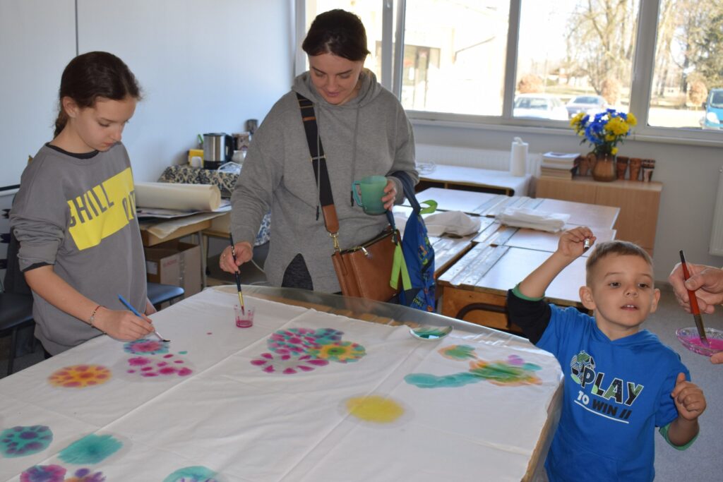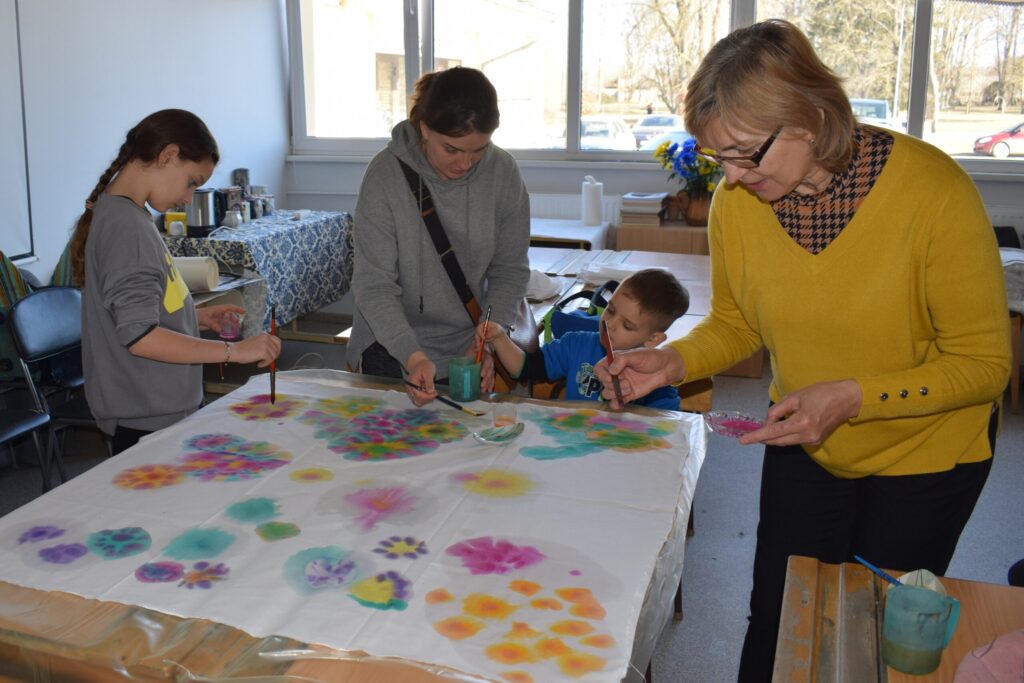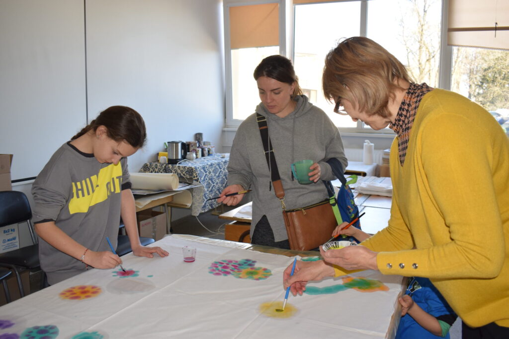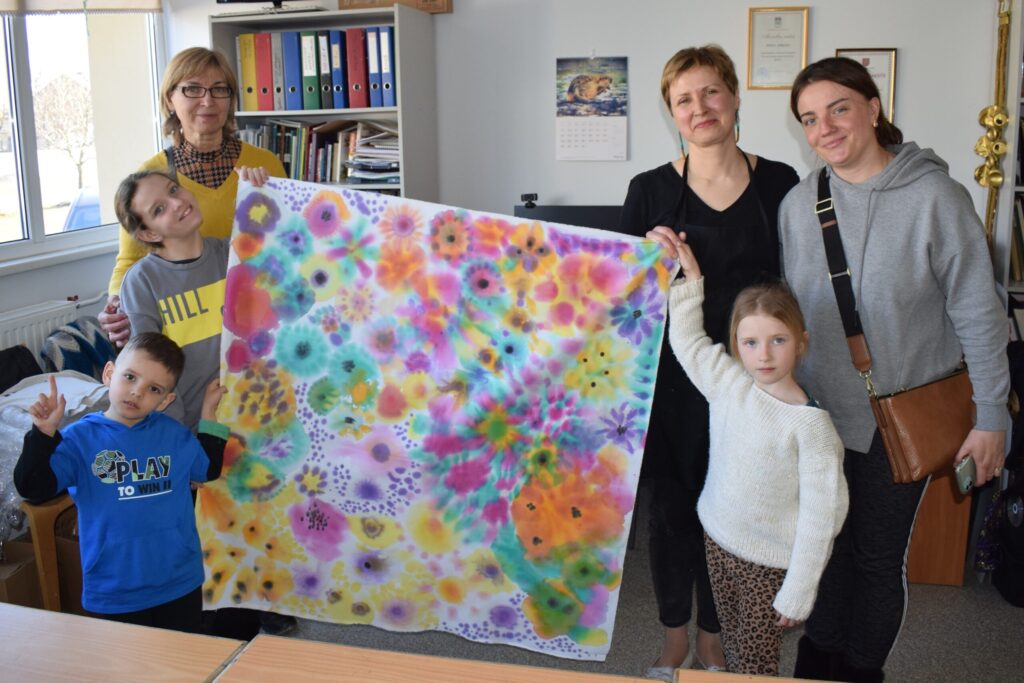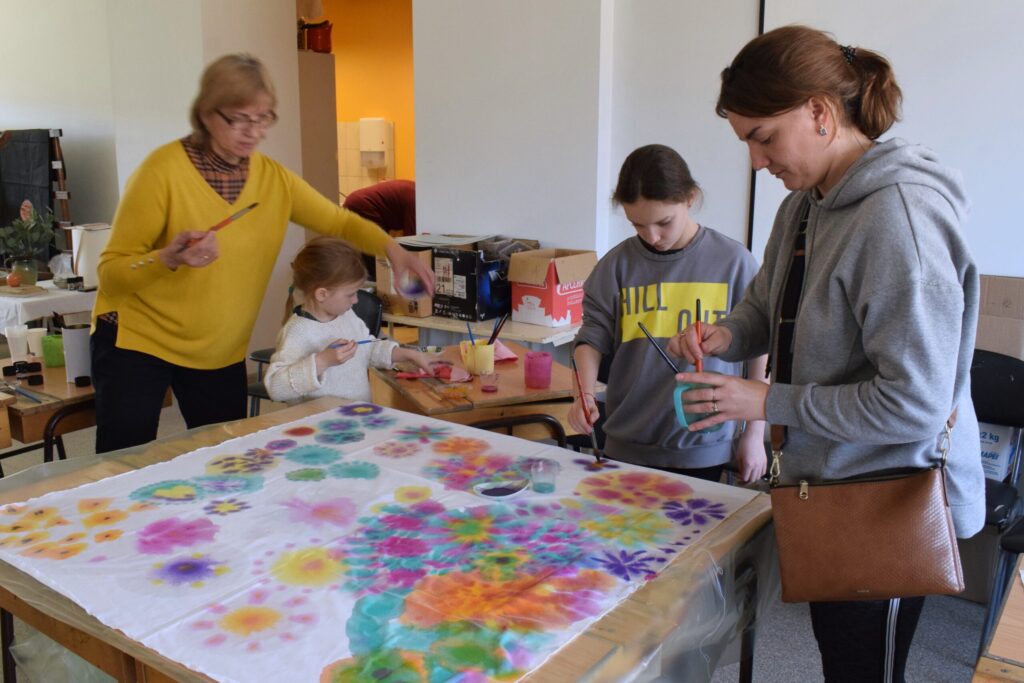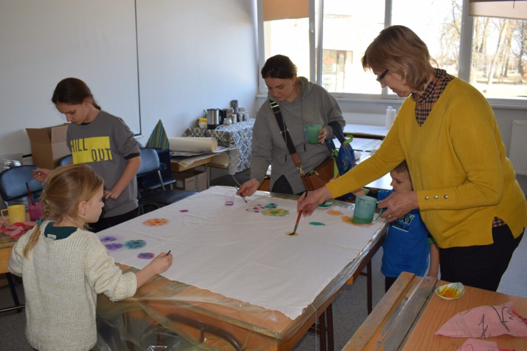 Vizuāli plastiskās mākslas skolotāja Antra Gustsone iedrošināja radīt grupas kopdarbu – galdautu. Kad bija ierādīts, kā strādāt ar otām, krāsām un ūdeni, lai apgleznotu audumu, radnieciski saistītie ukraiņi no Kijivas ķērās pie darba. Vecākā no sievietēm – Jeļena Homenko – atklāj, ka Anna Docenko ir viņas meita, bet deviņus gadus vecā Darja un četrgadīgais Boriss – mazbērni. Savukārt piecgadniece Jeļizaveta Končaka ir Jeļenas māsasmeitas Alises atvase; viņa ir māsa astoņus mēnešus vecajai Evai.