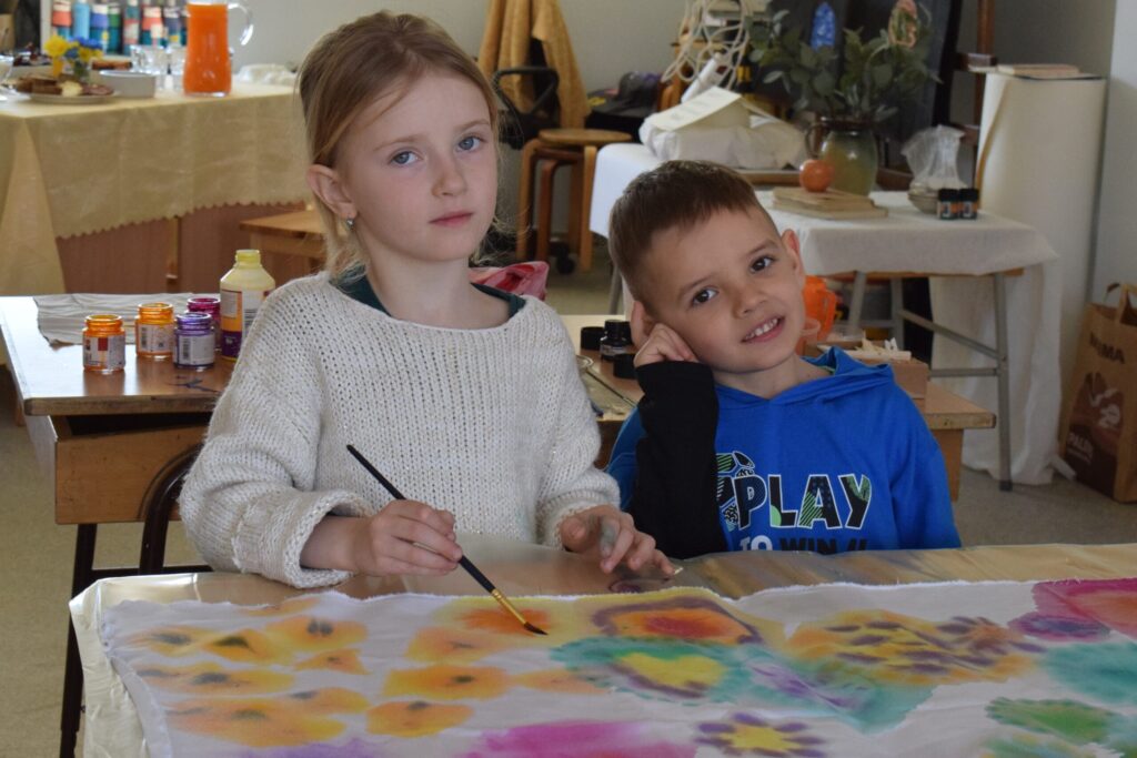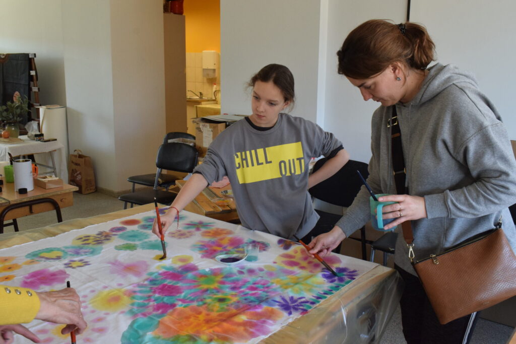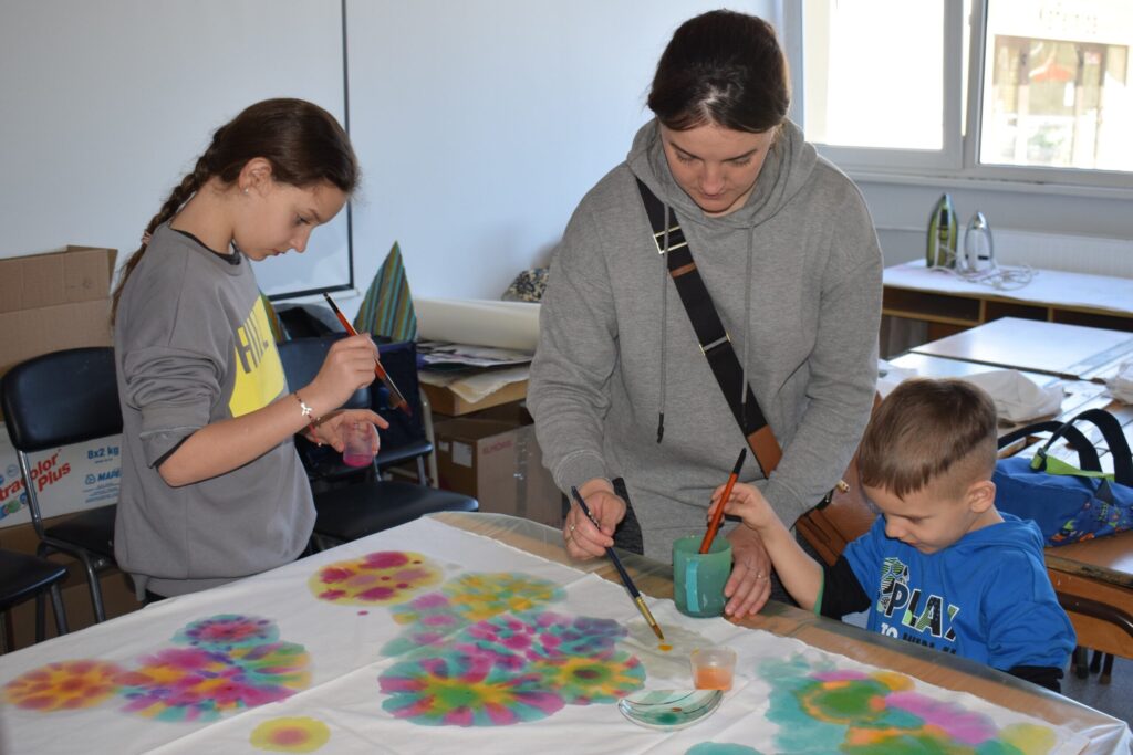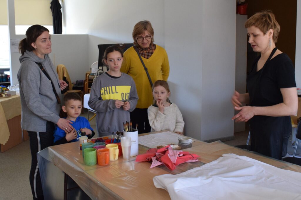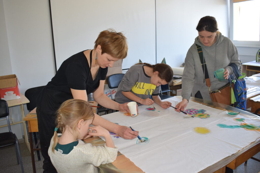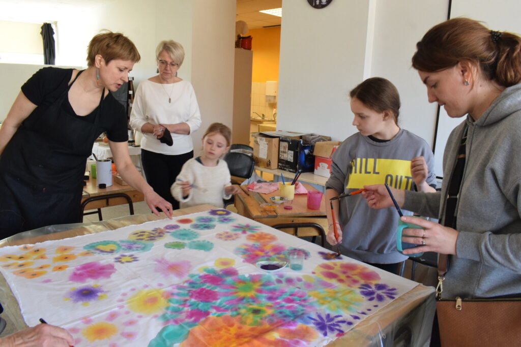 Vizuāli plastiskās mākslas skolotāja Antra Gustsone iedrošināja radīt grupas kopdarbu – galdautu. Kad bija ierādīts, kā strādāt ar otām, krāsām un ūdeni, lai apgleznotu audumu, radnieciski saistītie ukraiņi no Kijivas ķērās pie darba. Vecākā no sievietēm – Jeļena Homenko – atklāj, ka Anna Docenko ir viņas meita, bet deviņus gadus vecā Darja un četrgadīgais Boriss – mazbērni. Savukārt piecgadniece Jeļizaveta Končaka ir Jeļenas māsasmeitas Alises atvase; viņa ir māsa astoņus mēnešus vecajai Evai.