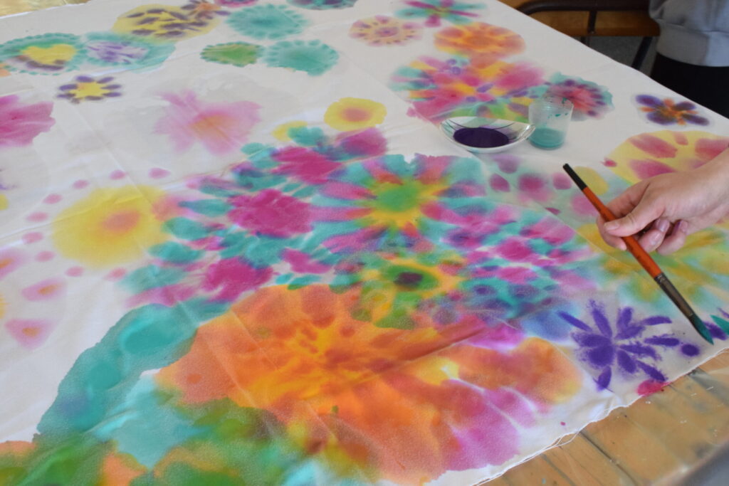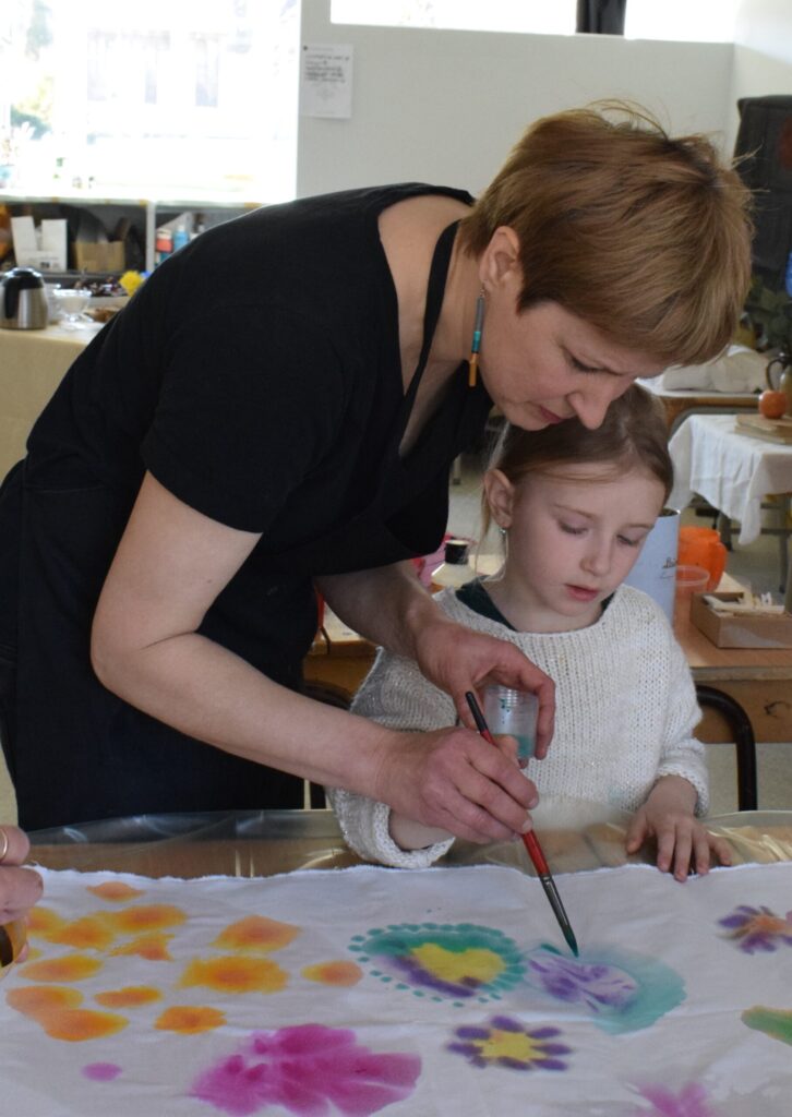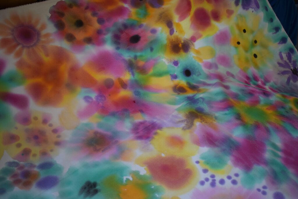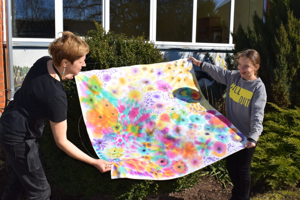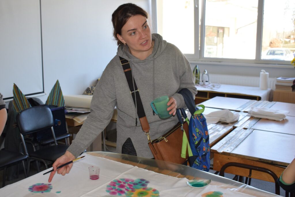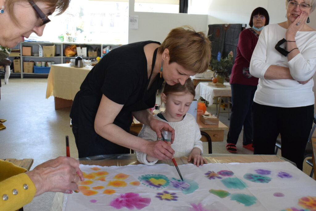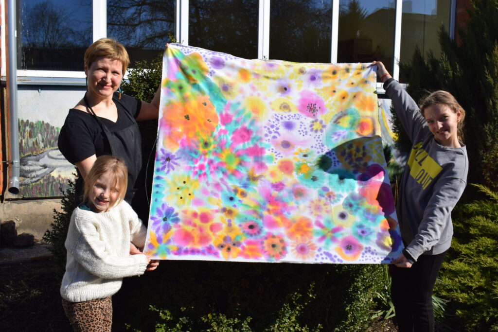 Anna savulaik mācījusies mūzikas skolā, Darja aizrāvusies ar dejošanu, bet vizuāli plastiskajā mākslā neviens iepriekš nav izkopis prasmes. Skolotāja nomierināja, ka tas arī nav nepieciešams, jo «šodienas darbošanās būs spēle ar krāsām un ūdeni». «Tikai nevajag zīmēt! Jāuzticas krāsām un ūdenim,» ik pa brīdim atgādināja A. Gustsone, «raibinot audumu, vajadzīga vien liela pacietība un jāliek lietā iztēle.» Pamazām galdauts ieguva izteiksmīgus akcentus, radot stilizēta puķu dārza noskaņu. Lieldienas vairs nav tālu, tāpēc izvēlēti košāki toņi.