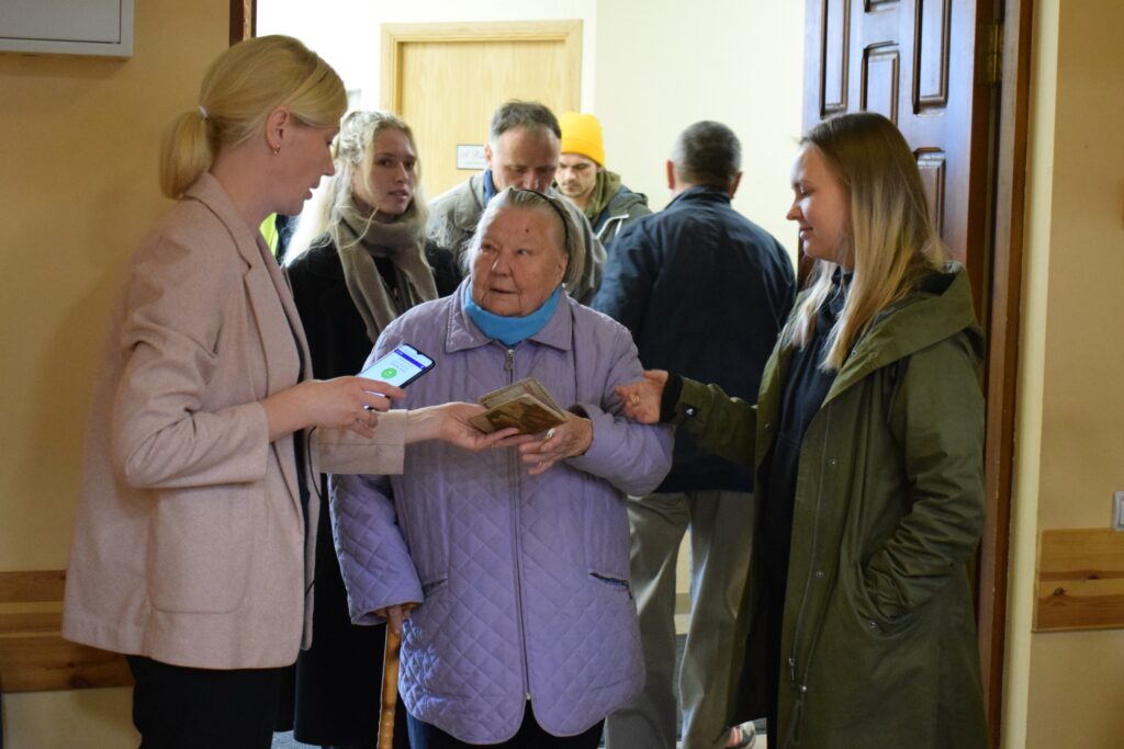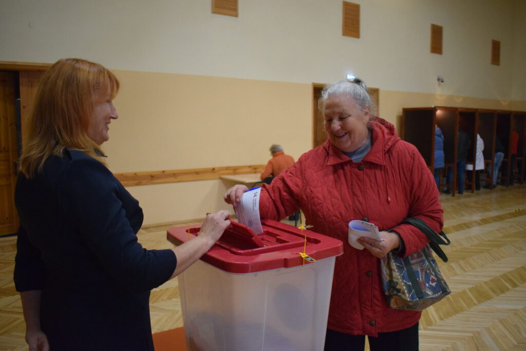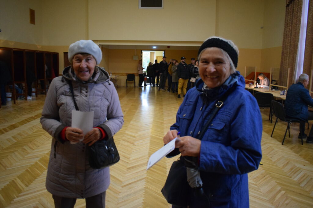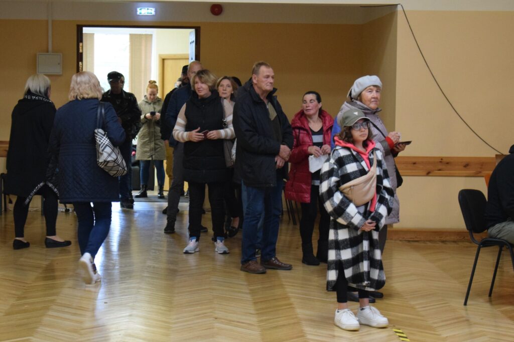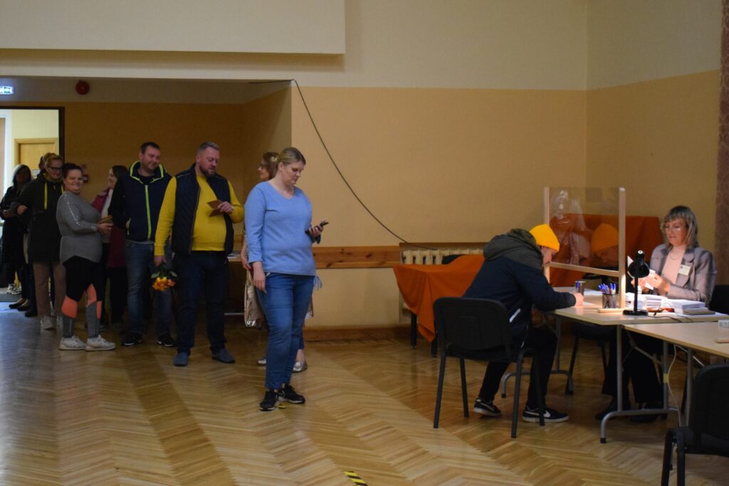 FOTO: Vecumniekos rinda pie vēlēšanu iecirkņa balsotājiem uzlabo noskaņojumu