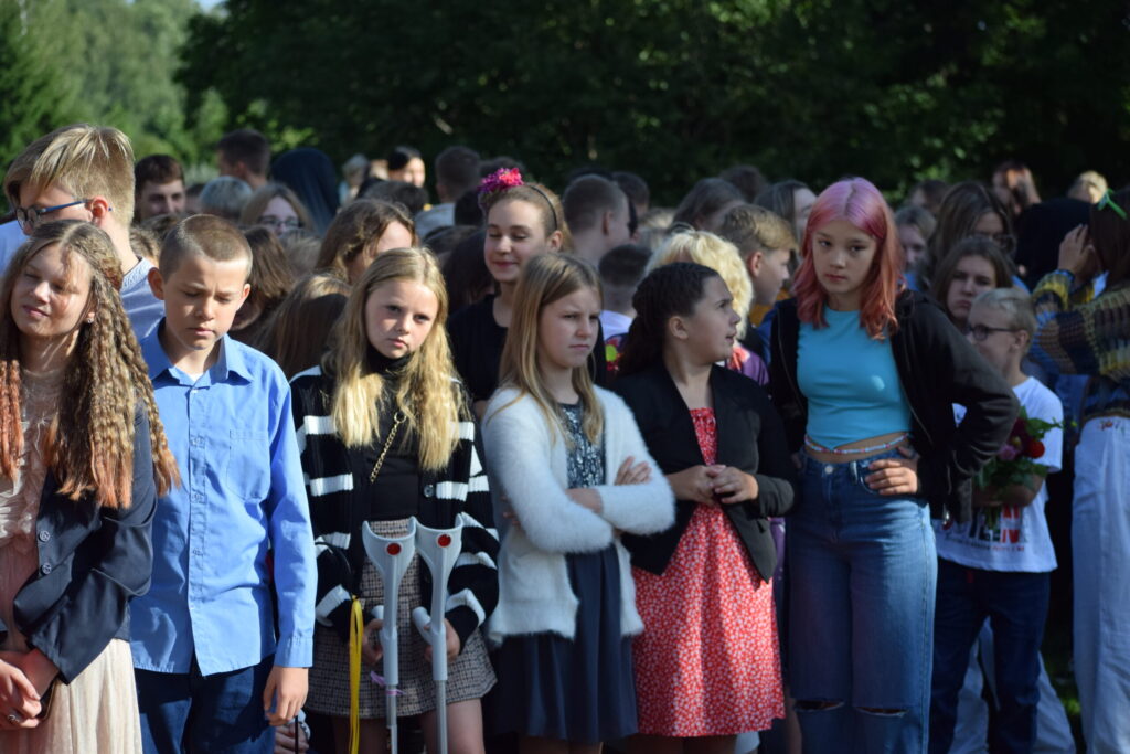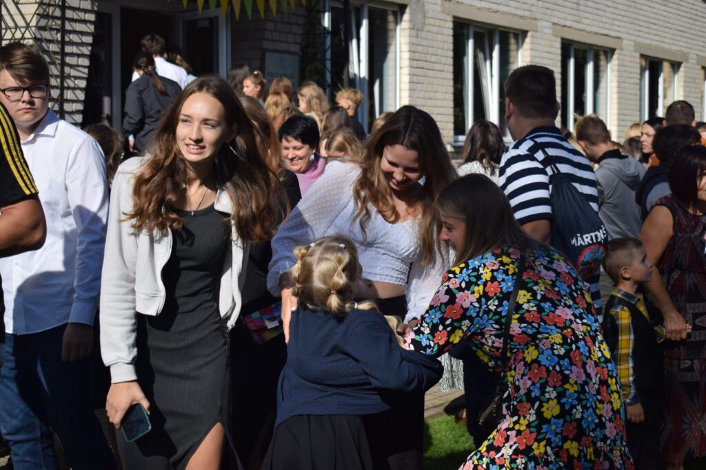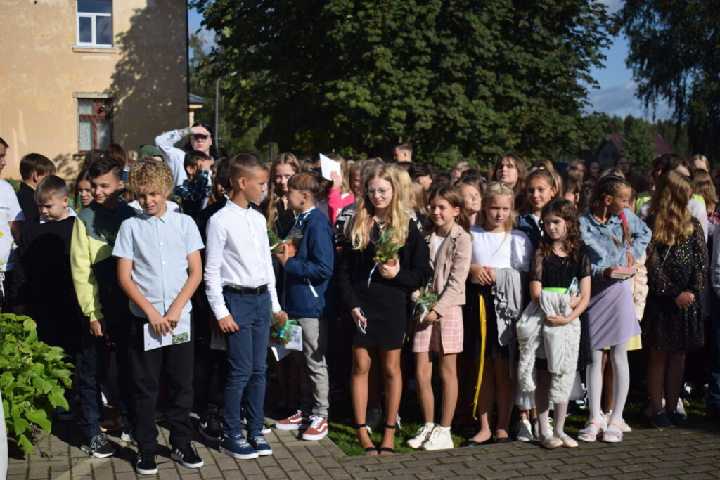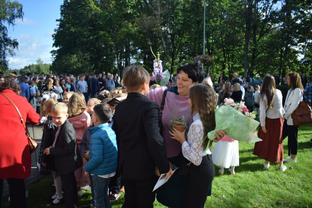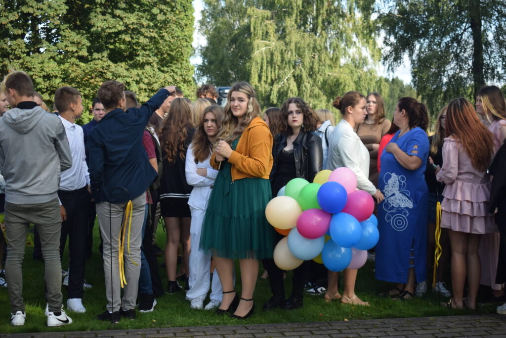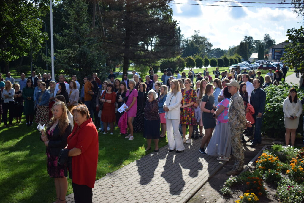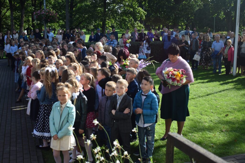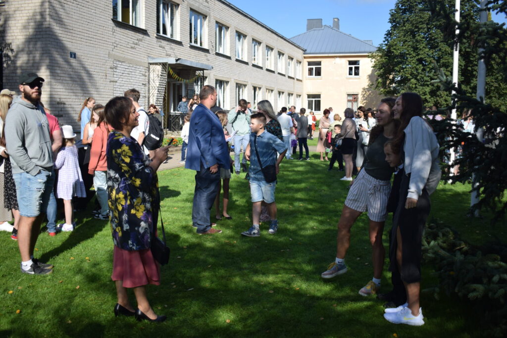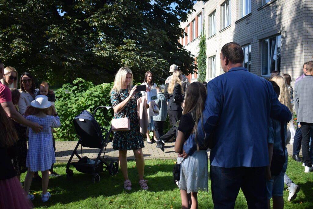 Zālienā bija izkārtojušies klašu kolektīvi, bet mazliet tālāk stāvēja bērnu vecāki un vecvecāki. Skolēni bija saposušies un priecīgi, noilgojušies pēc draugiem un sen neredzētiem klases biedriem, tāpēc bija grūti nesarunāties un visu uzmanību veltīt notiekošajam uz skolas kāpnēm, kur vietu bija ieņēmusi izglītības iestādes vadība – direktors un viņa vietnieces.
