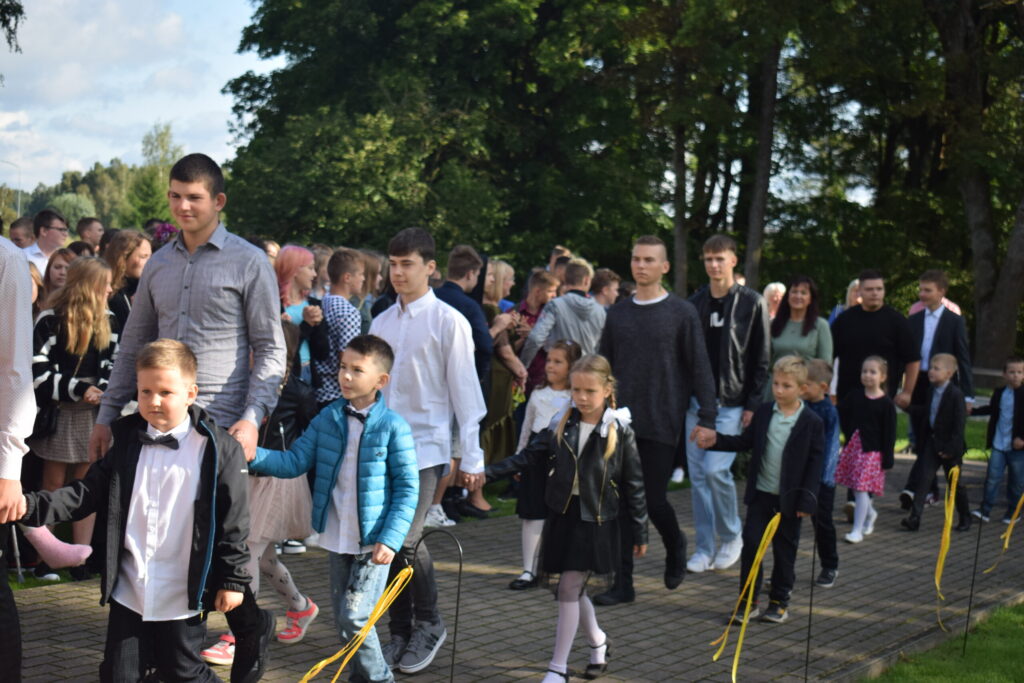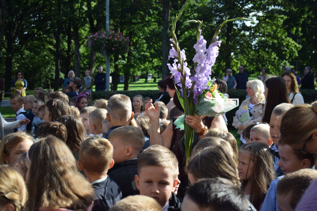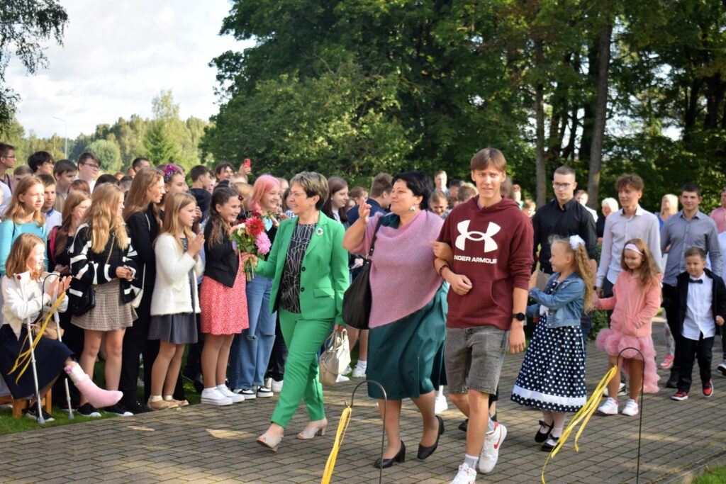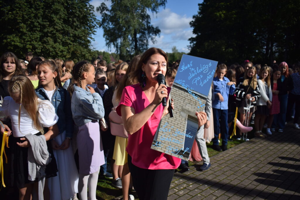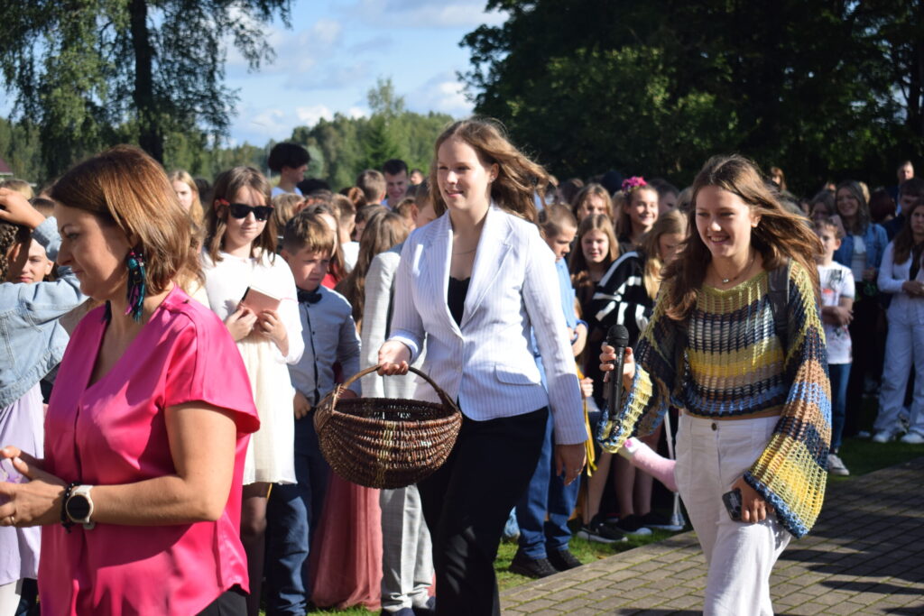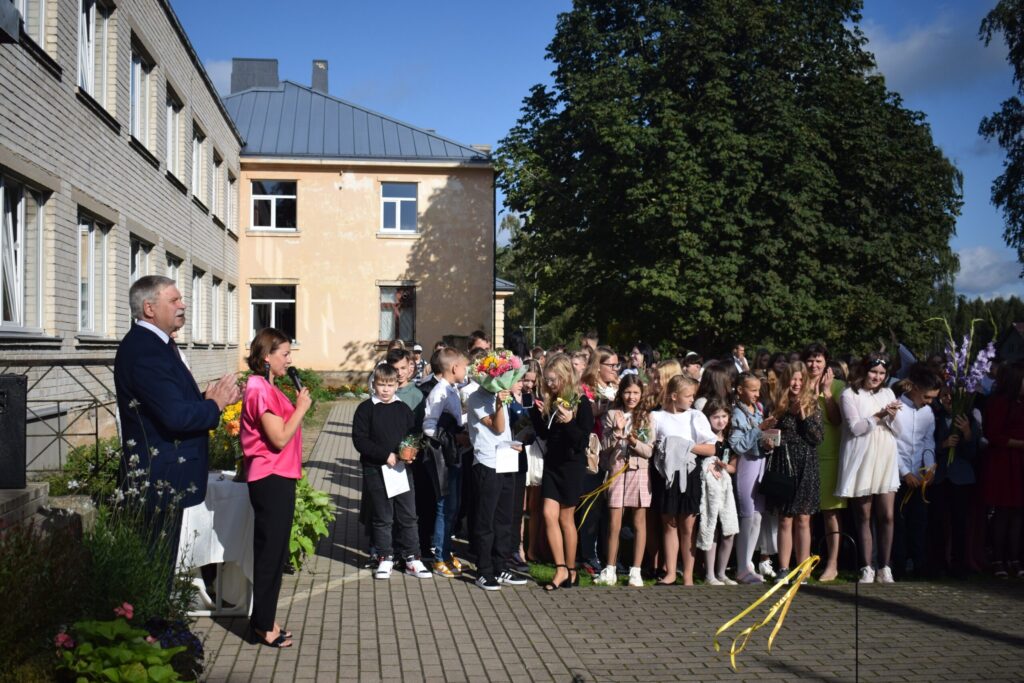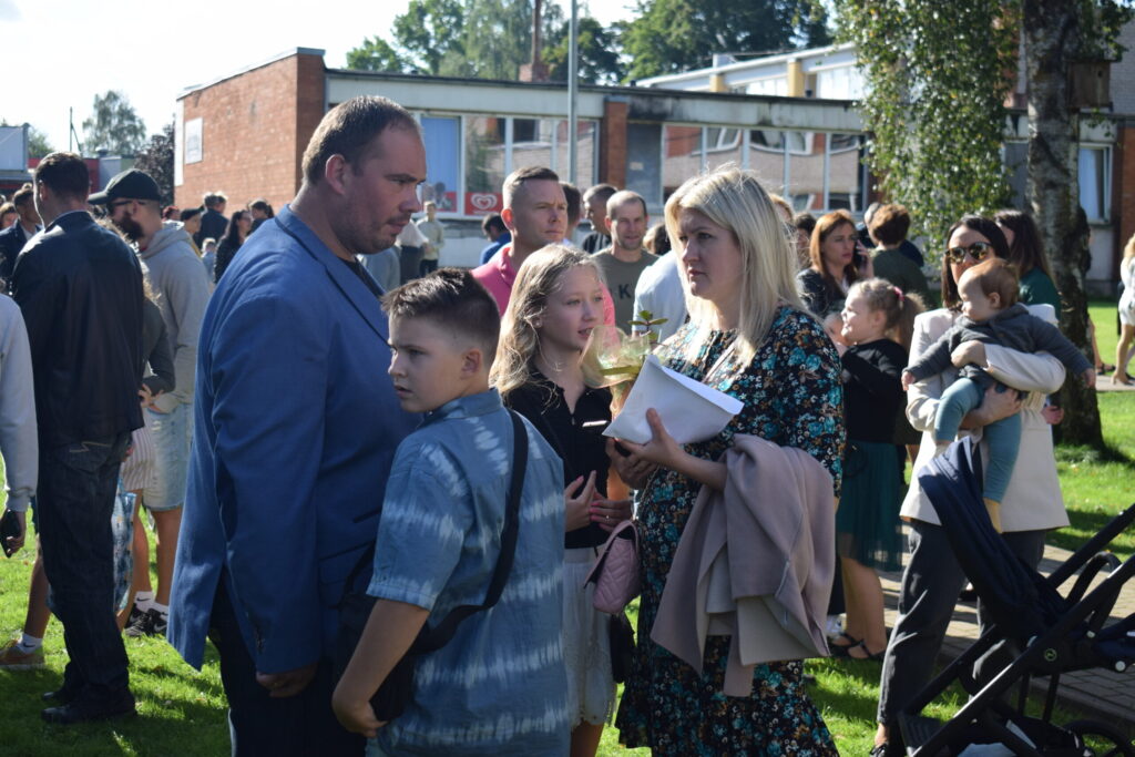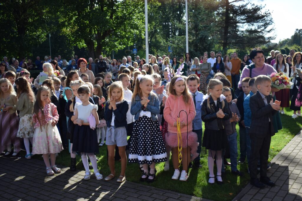 Zālienā bija izkārtojušies klašu kolektīvi, bet mazliet tālāk stāvēja bērnu vecāki un vecvecāki. Skolēni bija saposušies un priecīgi, noilgojušies pēc draugiem un sen neredzētiem klases biedriem, tāpēc bija grūti nesarunāties un visu uzmanību veltīt notiekošajam uz skolas kāpnēm, kur vietu bija ieņēmusi izglītības iestādes vadība – direktors un viņa vietnieces.