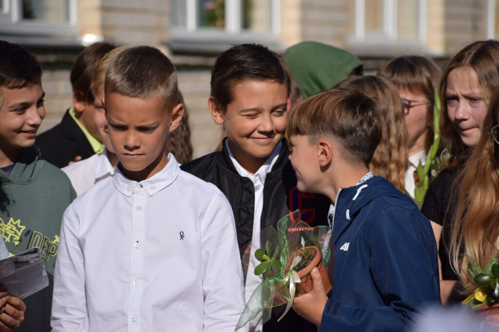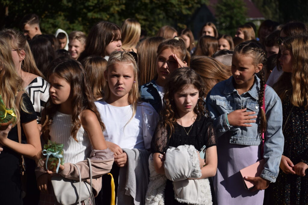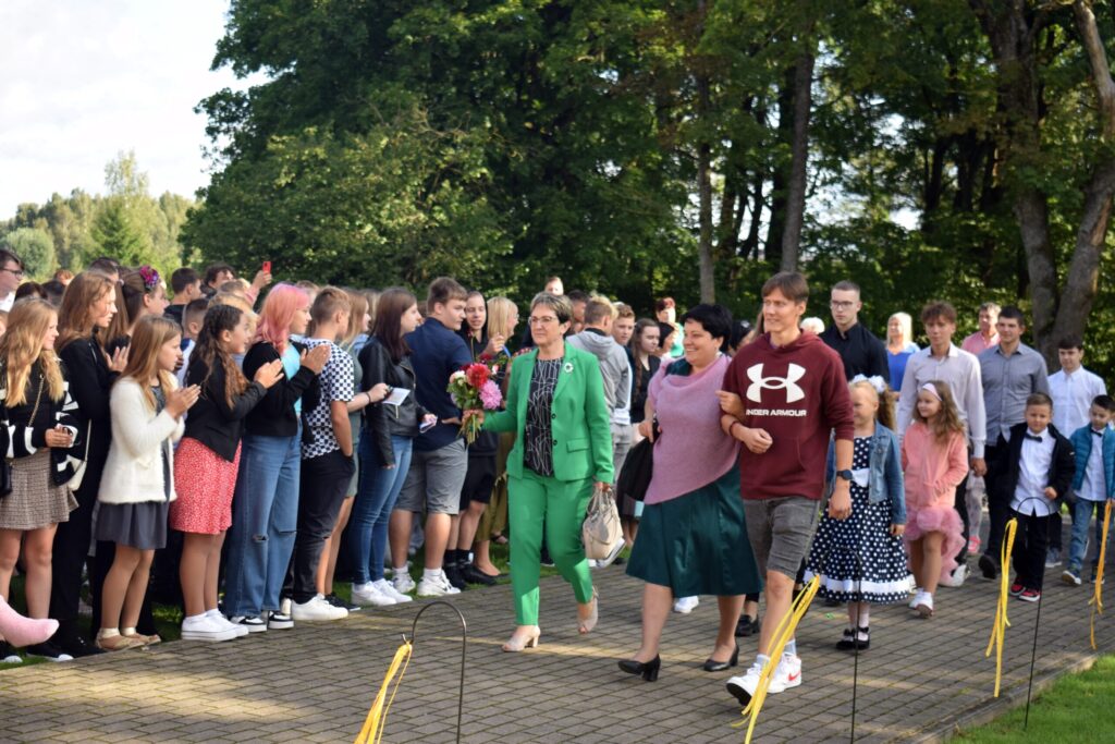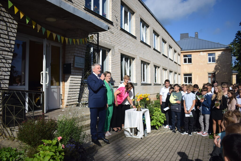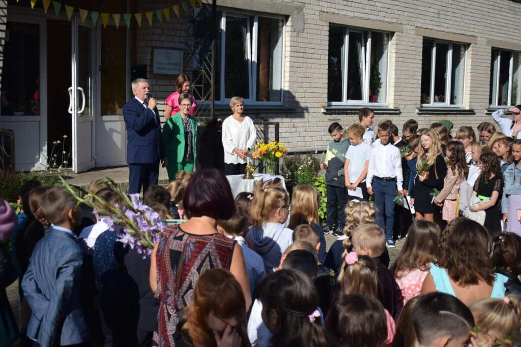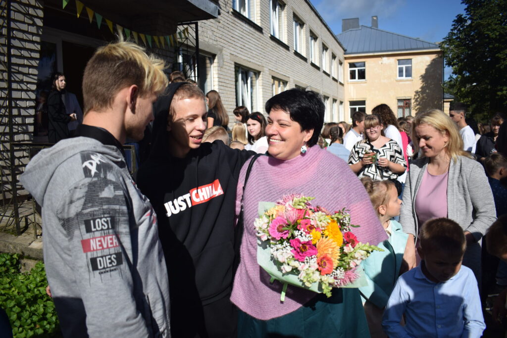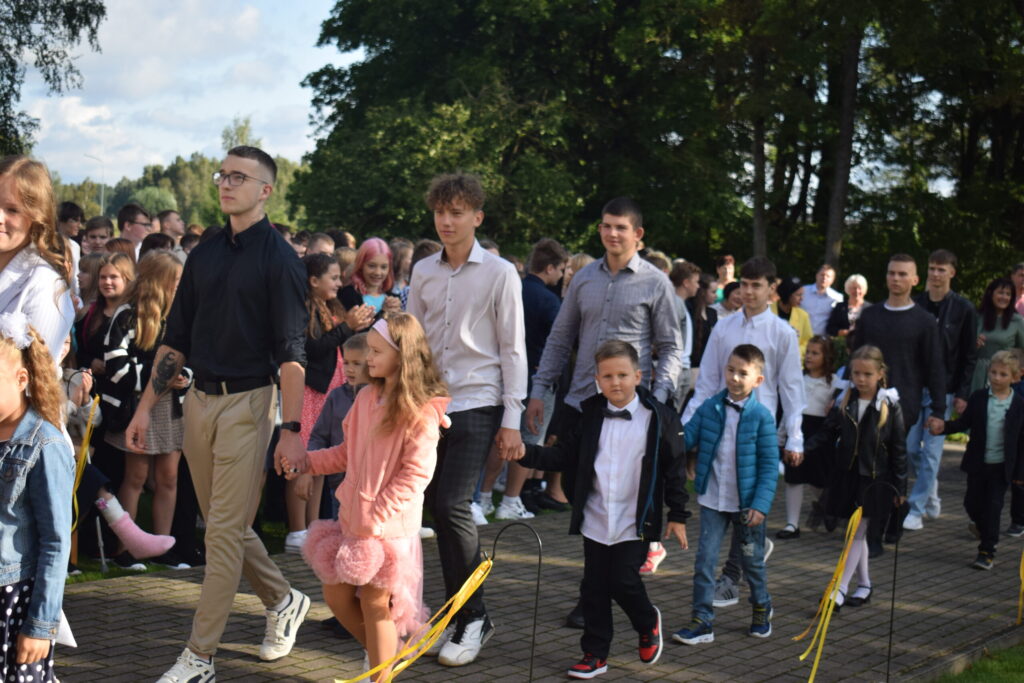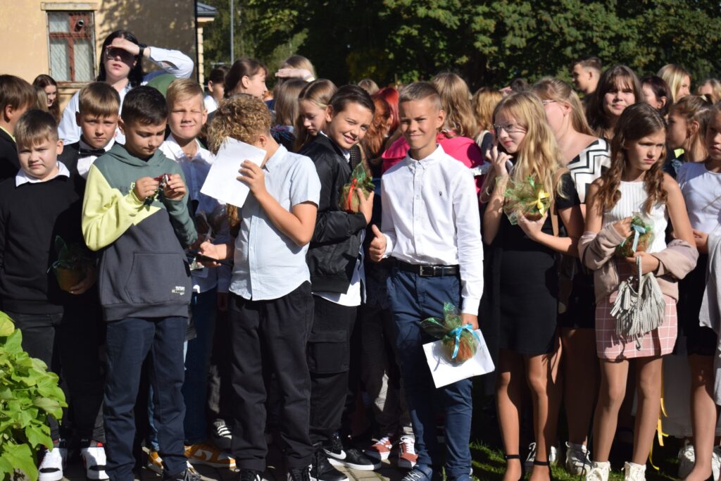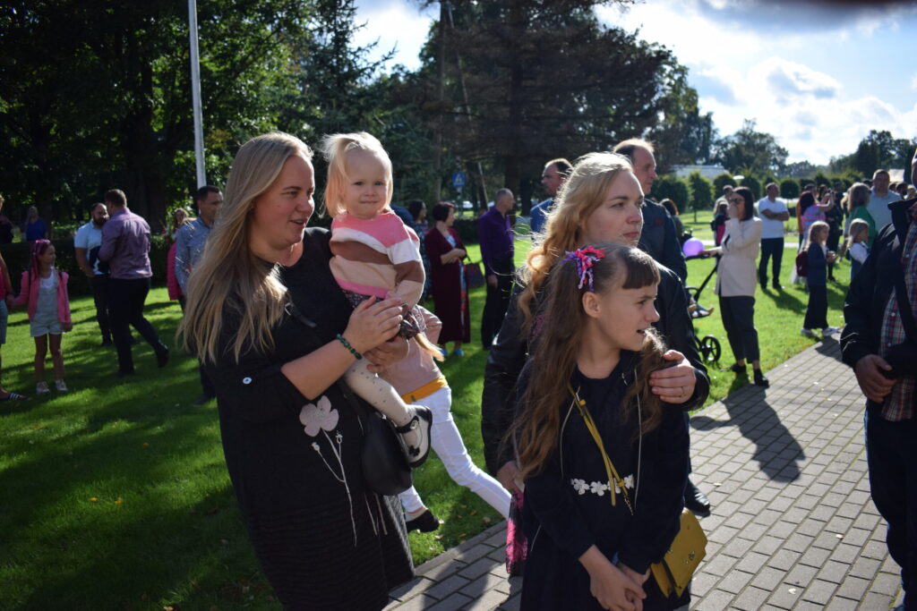 Zālienā bija izkārtojušies klašu kolektīvi, bet mazliet tālāk stāvēja bērnu vecāki un vecvecāki. Skolēni bija saposušies un priecīgi, noilgojušies pēc draugiem un sen neredzētiem klases biedriem, tāpēc bija grūti nesarunāties un visu uzmanību veltīt notiekošajam uz skolas kāpnēm, kur vietu bija ieņēmusi izglītības iestādes vadība – direktors un viņa vietnieces.
